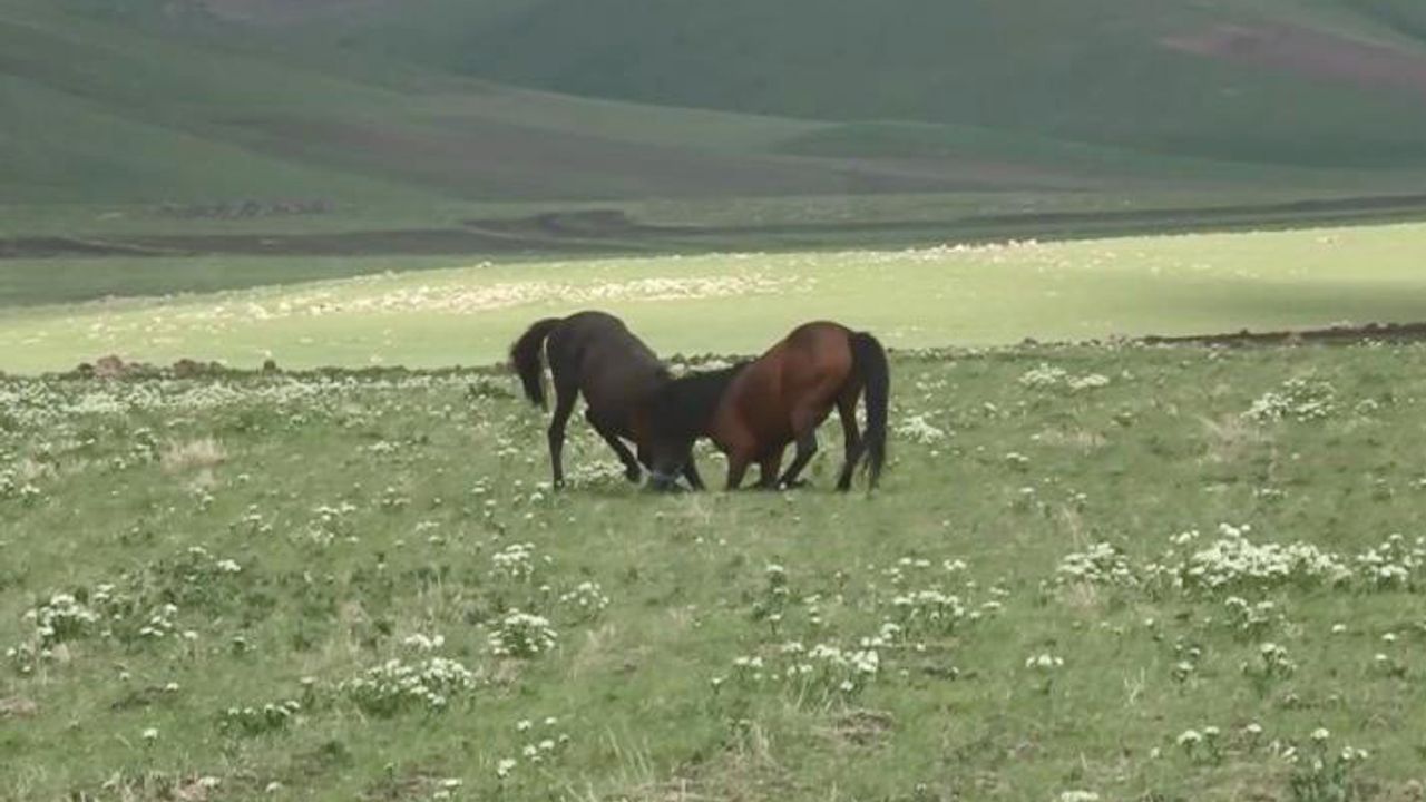 Digor ilçesine bağlı Karakale köyü merasına gelen çok sayıda yılkı atı, hem karınlarını doyurdu, hem de koşarak bir birleriyle oynadı. Güreş tutan 2 yılkı atı ise anbe an kaydedildi. Yılkı atları daha sonra hızla koşarak bölgeden ayrıldı.