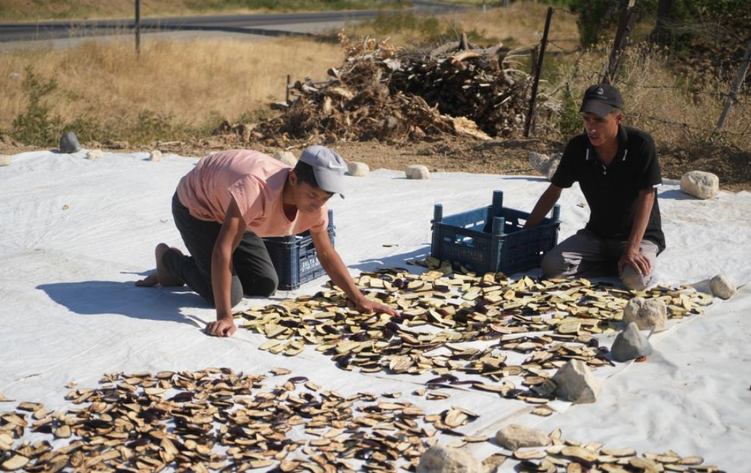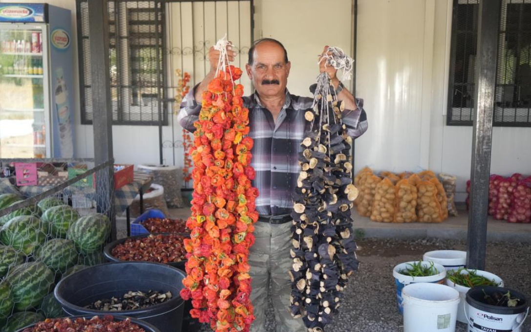 Kentte kış sofralarının vazgeçilmezleri arasında yer alan kurutulmuş sebze sezonu tüm hızıyla sürerken, merkeze 25 kilometre uzaklıktaki Mercimekkale köyünde yaşayanlar ise yol kenarında kurdukları tezgâhlarda kurutmalık biber, patlıcan ve kabak satarak hem kışlık hazırlıklarını tamamlıyor hem de aile bütçelerine katkı sağlıyor.