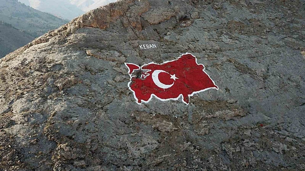 Elazığ'ın Keban ilçesi içerisinde yer alan Kıjkıjık Dağı'nın kayalığı üzerine, ressam Abdullah Bulut tarafından 400 metrekare büyüklüğünde çizilen ay yıldızlı Türkiye haritasının boyası yenilendi.