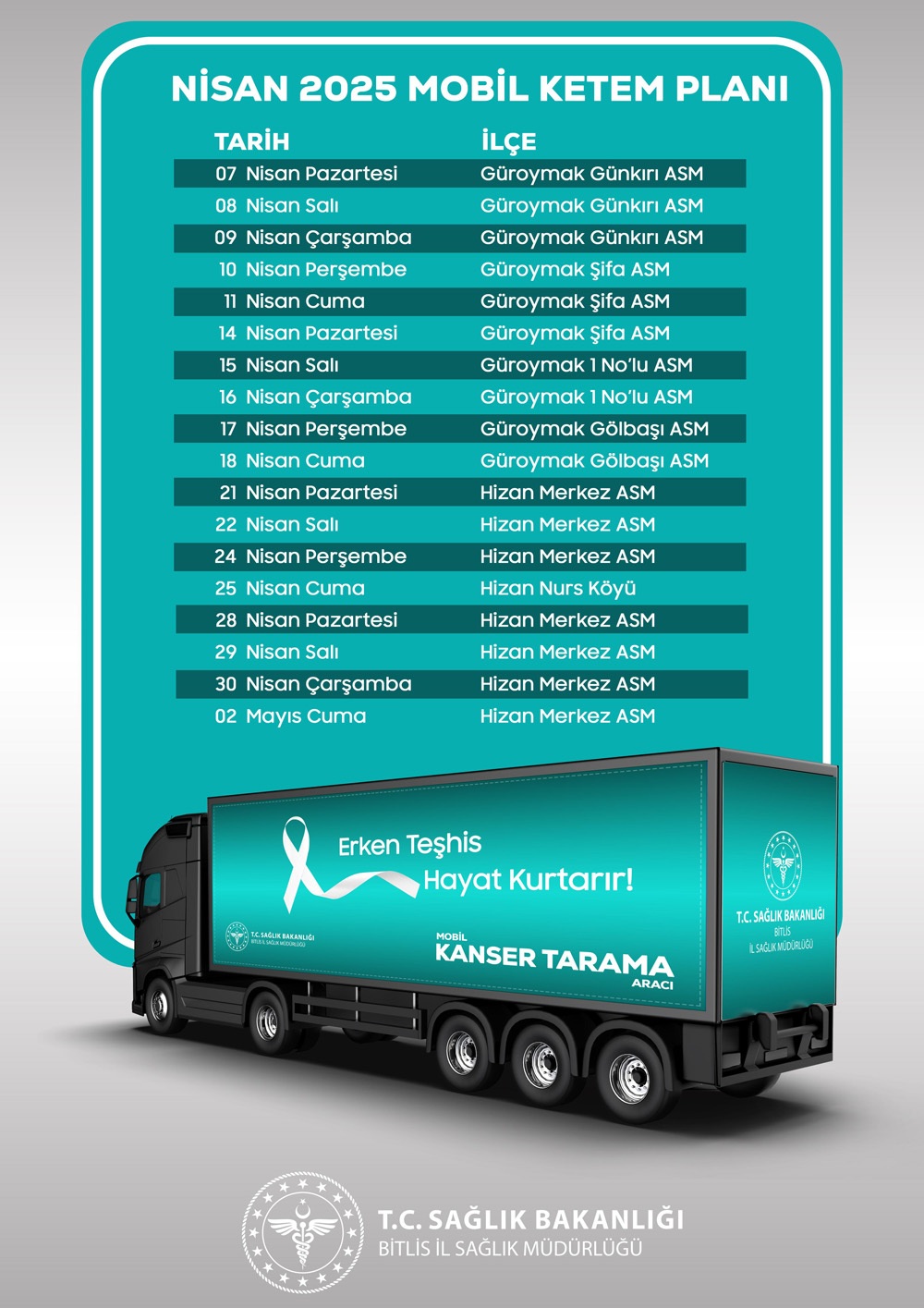 Bitlis İl Sağlık Müdürlüğü tarafında yapılan açıklamada KETEM aracının Nisan ayının ilk yarısına kadar Güroymak ilçesinde diğer yarısında ise Hizan ilçesinde hizmet vereceğini belirtildi. Açıklamada şu ifadelere yer verildi; “ İlk olarak Güroymak ilçesine bağlı Günkırı Beldesi Yamaç Köyü’nde konumlandırılan mobil araçta, vatandaşlara ücretsiz olarak kanser tarama hizmetleri sunulmaktadır. Tarama hizmetleri; meme, rahim ağzı ve kalın bağırsak kanserlerine yönelik olup, erken teşhis amacıyla yürütülmektedir. Nisan ayı boyunca Güroymak ve Hizan ilçelerinde sürdürülecek olan bu hizmetle, erken tanının önemi vurgulanarak vatandaşların tarama hizmetlerine erişimlerinin artırılması hedeflenmektedir.”