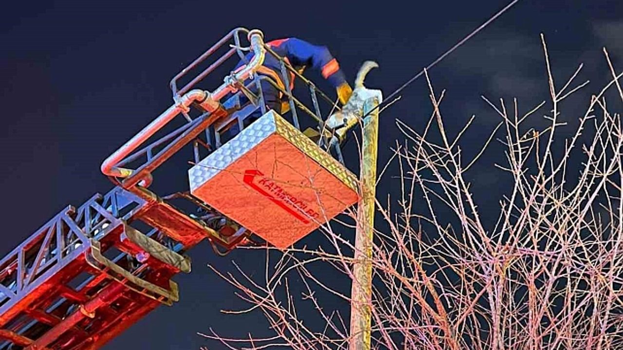 Van'ın Tuşba ilçesine sokak köpeklerinden kaçarken çıktığı direkte mahsur kalan kedi, itfaiye ekipleri tarafından kurtarıldı.