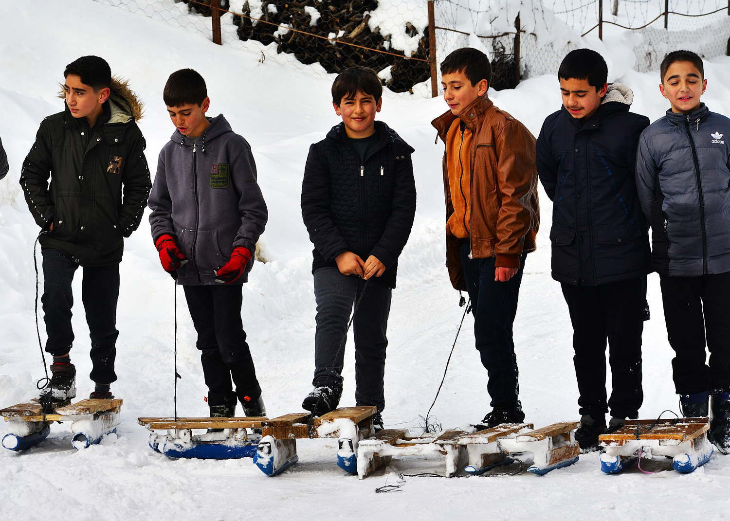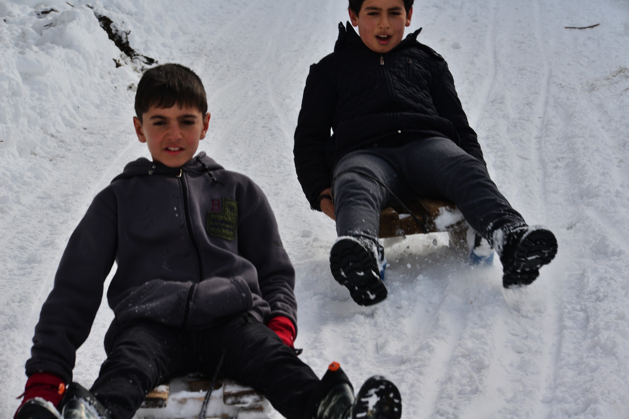 Karla kaplanan yamaçlarda ve köy yollarında tahta kızaklarla kayan çocuklar, neşeli anlar yaşadı. Soğuk havaya rağmen dışarıda vakit geçiren çocuklar, arkadaşlarıyla birlikte kaymanın mutluluğunu yaşarken, ortaya renkli görüntüler çıktı.
