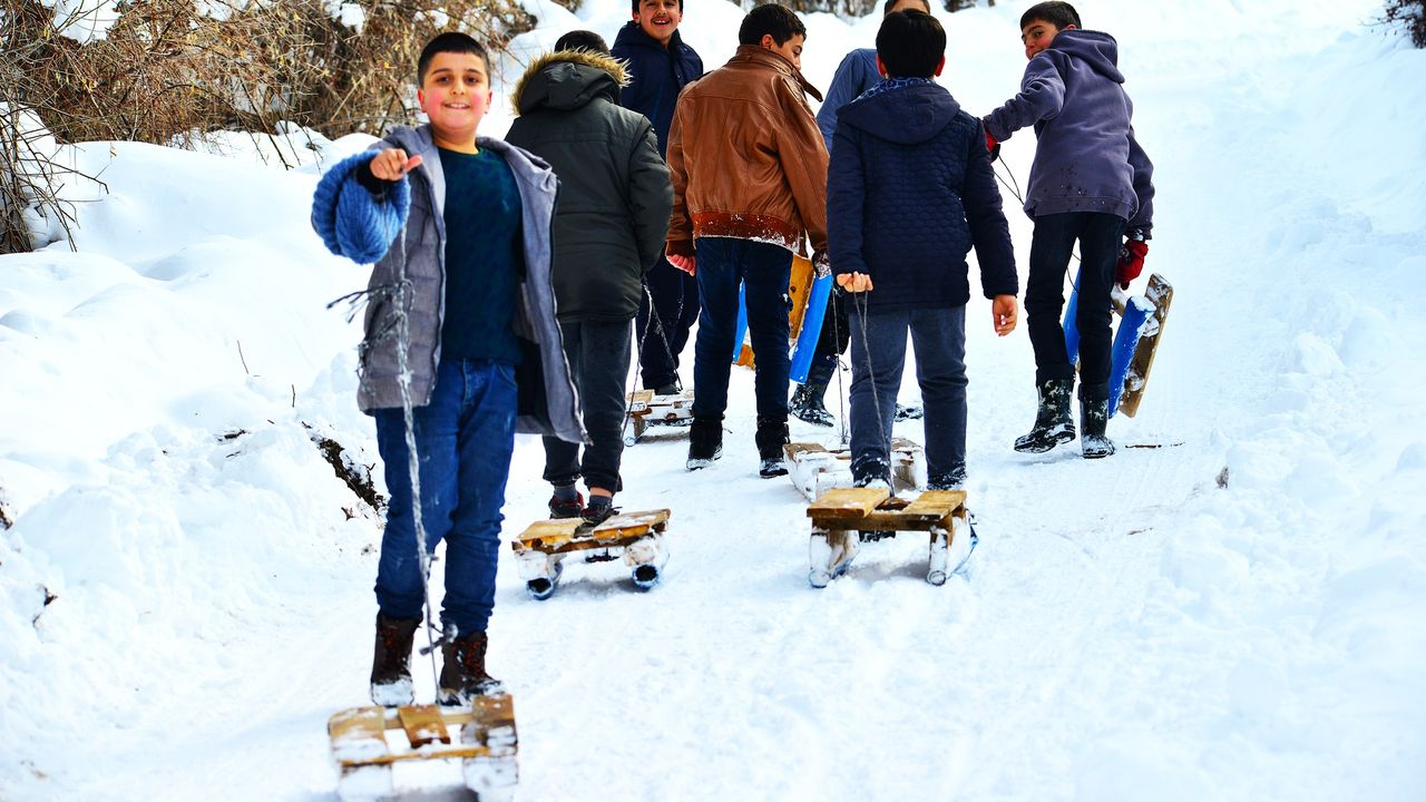 Ara tatili fırsat bilen köy çocukları, tahta kızaklarla kayarak kışın ve tatilin keyfini doyasıya çıkarıyor. Özellikle kırsal bölgeler ve köylerde etkili olan yoğun kar yağışı nedeniyle ulaşımda aksamalar yaşanırken, çocuklar bu durumu eğlenceye dönüştürdü.