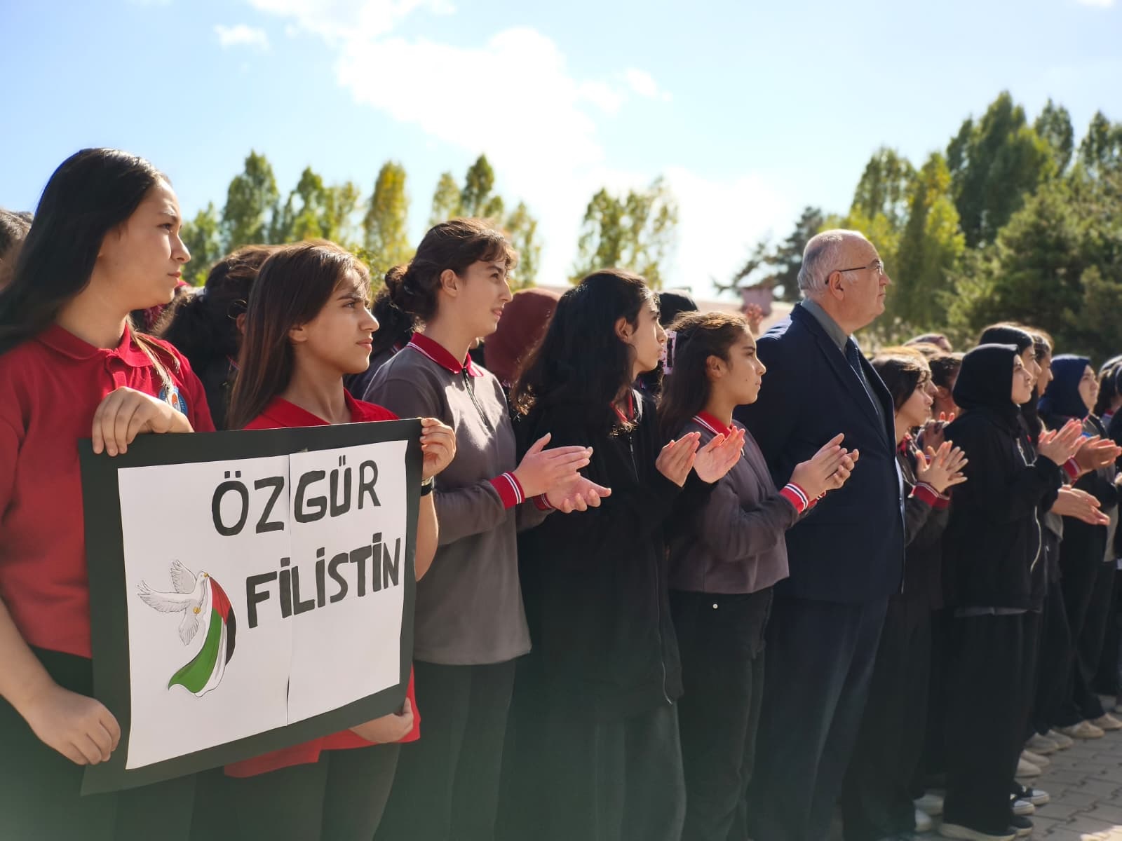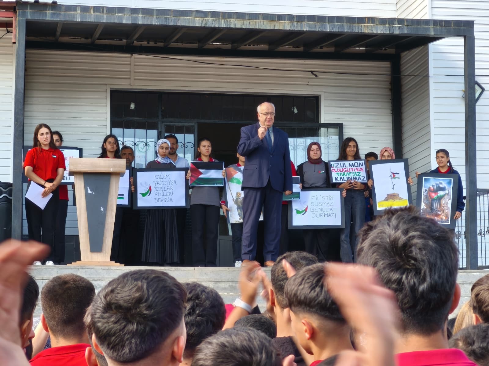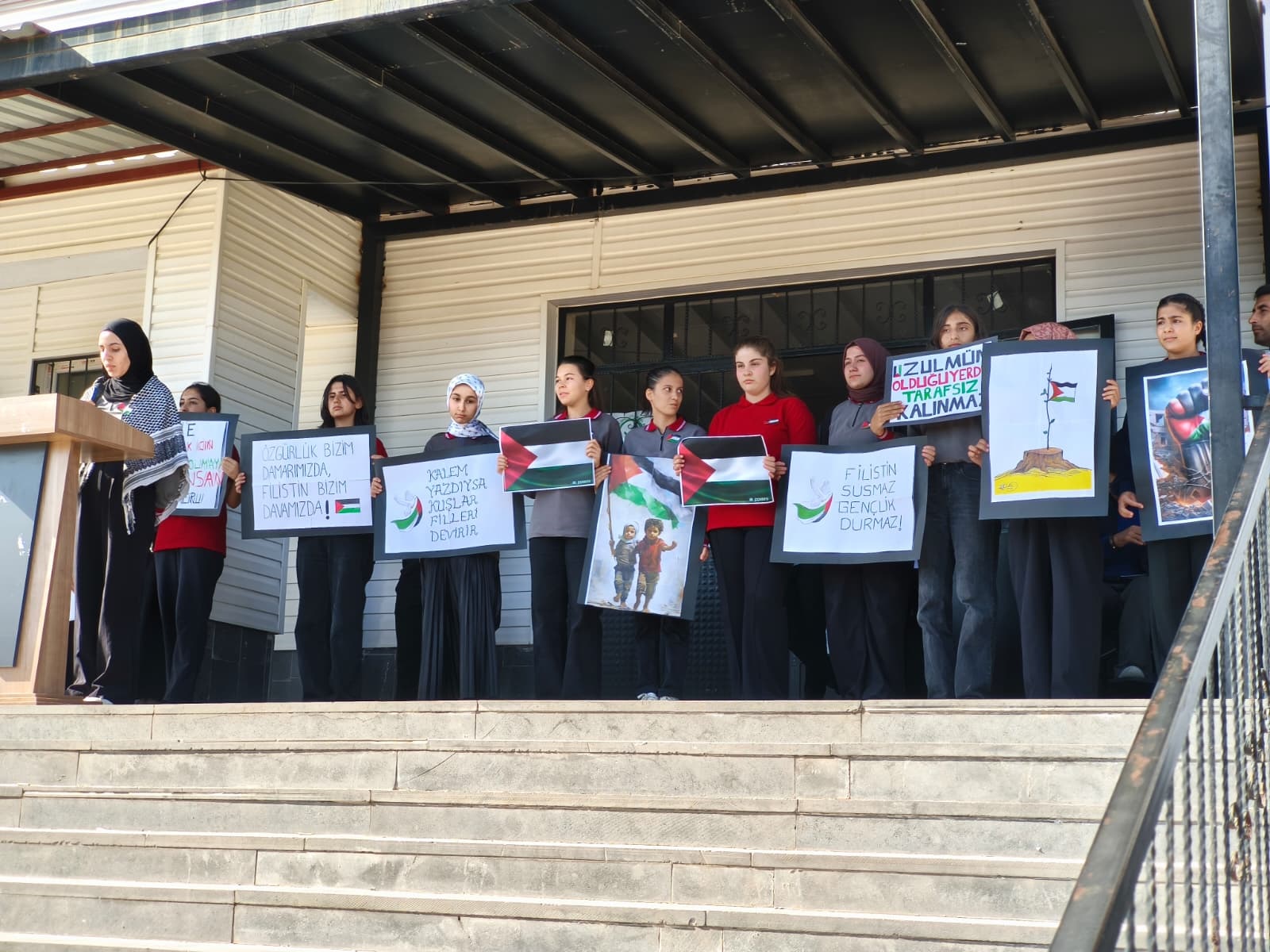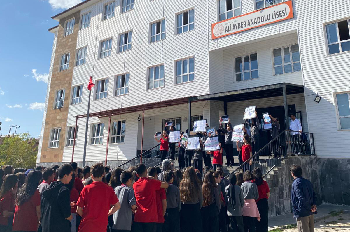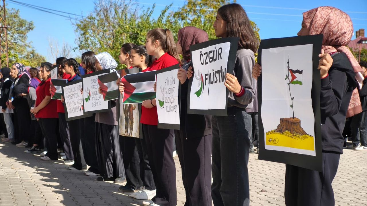 Okul idaresi ve öğretmenlerinde katılımıyla okul bahçesinde düzenlenen etkinlikte öğrenciler çizdikleri resimler ve dövizlerle zulme uğrayan Filistinli ve Gazzeli kardeşlerinin yanında oldukları mesajları verdi.