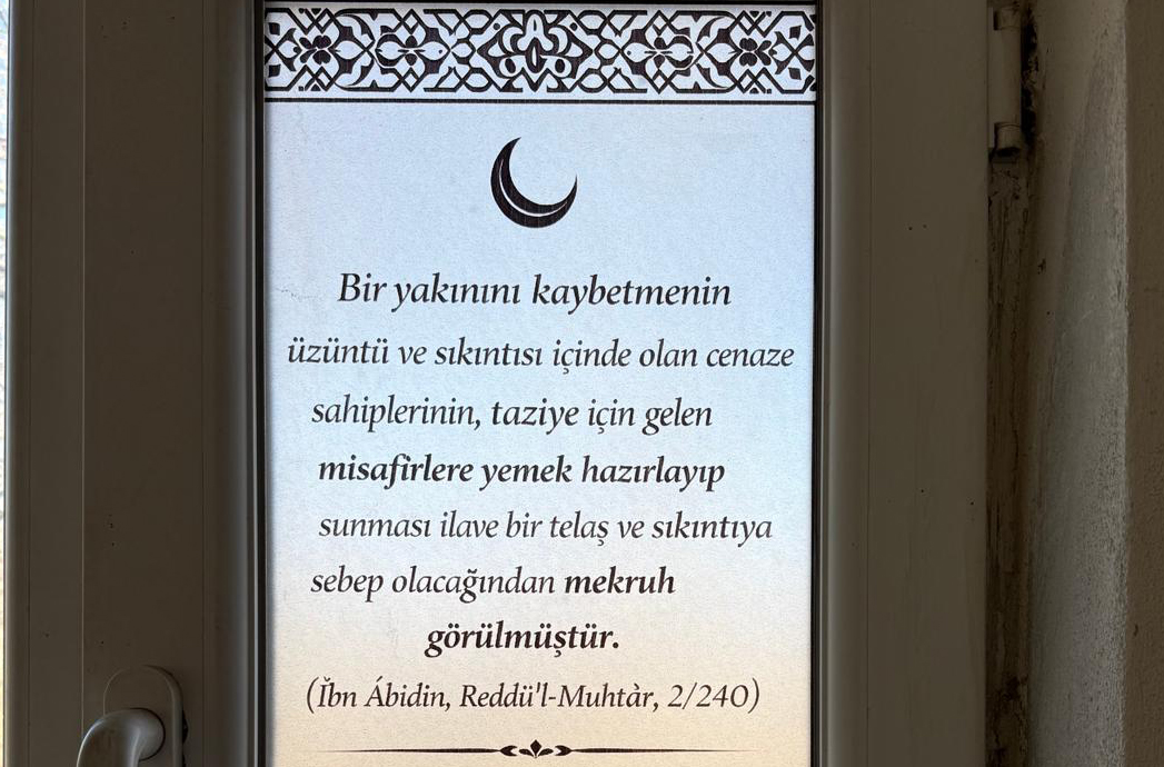 Asılan metinlerde, taziyelerde cenaze sahiplerine yük olunmaması gerektiği vurgulanırken, asıl olanın mahalle sakinlerinin cenaze sahiplerinin yükünü hafifletmek için yemek hazırlaması olduğu ifade edildi. Ayrıca cenaze evinde veya cenaze sahipleri tarafından yemek yapılarak taziyeye gelenlere ikramda bulunmasının dinen uygun görülmediği, bunun mekruh kabul edildiği belirtildi.