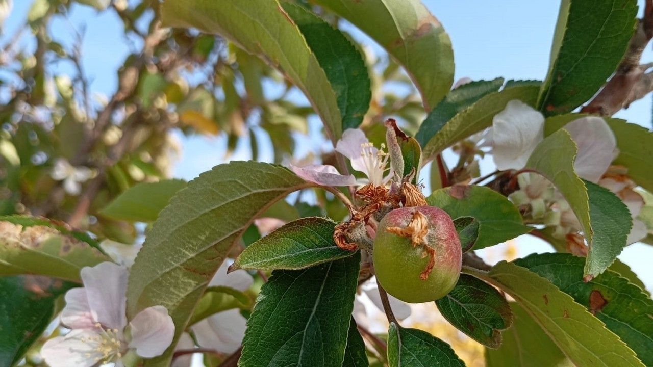 Malatya’nın Yazıhan ilçesinde bir elma ağacının kış aylarına sayılı günler kala çiçek açıp meyve vermesi görenleri şaşırttı.