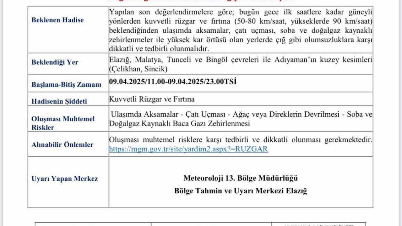 Çevre Şehircilik ve İklim Değişikliği Bakanlığı Meteoroloji Genel Müdürlüğü 13. Bölge Müdürlüğü tarafından Elazığ ve bölgesi için kuvvetli rüzgar ve fırtına uyarısında bulunuldu. Açıklamada, ‘’Yapılan son değerlendirmelere göre bugün gece ilk saatlere kadar güneyli yönlerden kuvvetli rüzgar ve fırtına (50-80 km/saat, yükseklerde 90 km/saat) beklendiğinden ulaşımda aksamalar, çatı uçması, soba ve doğalgaz kaynaklı zehirlenmeler ile yüksek kar örtüsü olan yerlerde çığ gibi olumsuzluklara karşı dikkatli ve tedbirli olunmalıdır. Bölgemizdeki beklenen sağanak ve gök gürültülü sağanak yağışlı toz taşınımı ile birlikte yer yer çamur şeklinde yağış görüleceği tahmin ediliyor’’ denildi.