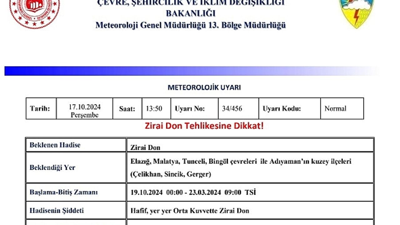 Meteoroloji 13. Bölge Müdürlüğü'nden yapılan açıklamada, 'Elazığ, Malatya, Tunceli, Bingöl çevreleri ile Adıyaman'ın kuzey ilçeleri (Çelikhan, Sincik, Gerger) hafif, yer yer orta kuvvette zirai don beklenmektedir. Oluşması muhtemel risklere karşı tedbirli ve dikkatli olunması gerekmektedir' denildi.