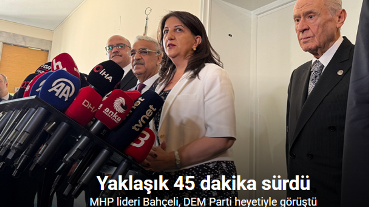 MHP Genel Başkanı Bahçeli, Türkiye Büyük Millet Meclisi’nde (TBMM) DEM Parti heyetini kabul etti. Heyette TBMM Başkanvekili ve DEM Parti Van Milletvekili Pervin Buldan, DEM Parti Şanlıurfa Milletvekili Mithat Sancar ve terör örgütü PKK elebaşı Abdullah Öcalan’ın avukatı Faik Özgür Erol yer aldı. Yaklaşık 45 dakika süren görüşmede, "Terörsüz Türkiye" sürecine dair gelişmeler ele alındı.