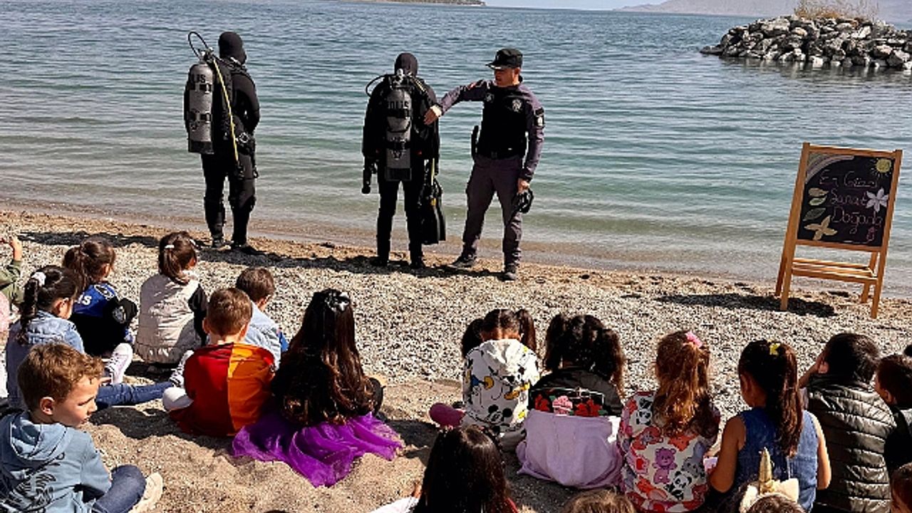 Bitlis’in Tatvan ilçesinde, anaokulu öğrencilerine dalış ekipmanlarının tanıtımı ve dalış gösterisi yapıldı.