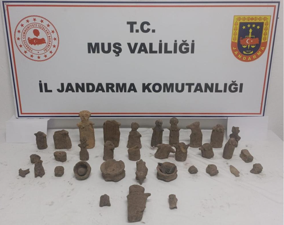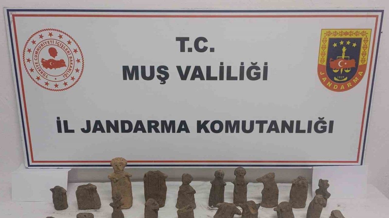 Muş Valiliğinden yapılan açıklamada, İl Jandarma Komutanlığı Kaçakçılık ve Organize Suçlarla Mücadele Şubesi ile İstihbarat Şubesi ekiplerinin kaçakçılıkla mücadele kapsamında yürüttüğü çalışmaların devam ettiği belirtildi. Açıklamada, "Şenoba köyü mülki sınırları içinde KOM ve İstihbarat Şube Müdürlüğünce F.M. (34) isimli şahsın elinde tarihi eser olduğuna dair elde edilen istihbari bilgiler neticesinde CMK’nın 160 ve 161’nci maddeleri çerçevesinde Muş Cumhuriyet Savcısından alınan görevlendirme kararı gereği şüpheli şahısla irtibat kurularak 11 Nisan 2025 günü D-955 karayolu (Muş-Bingöl karayolu) üzerinde buluşma sağlanarak, F.M. ve C.S. (31) isimli şahıslar 42 parça tarihi eser olduğu değerlendirilen 4 bin yıl öncesi Demir Çağı Dönemi’ne ait heykel ve diğer objeler ile birlikte suçüstü yakalanmıştır" denildi.