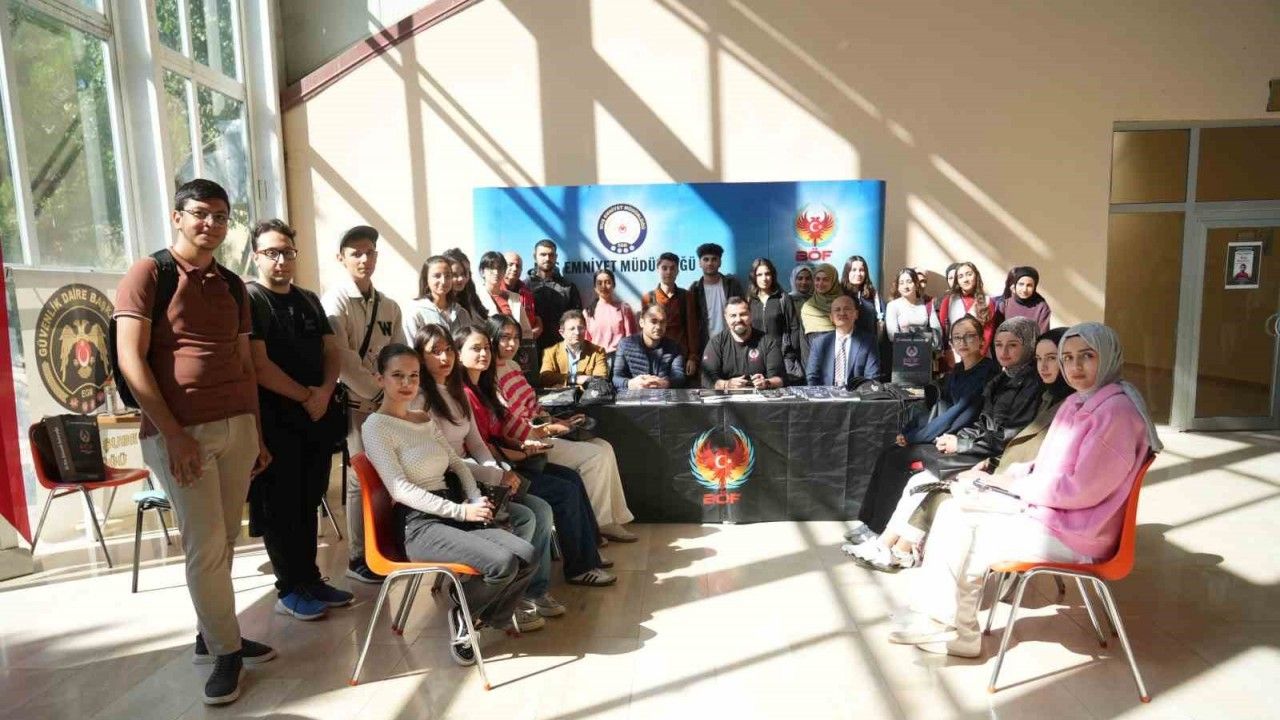 Muş Emniyet Müdürlüğü ekipleri, "El Ele Güvenli Geleceğe" projesi kapsamında üniversitede eğitim gören öğrencileri çeşitli konularda bilgilendirdi.