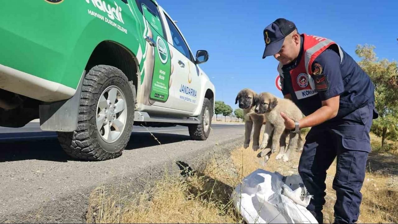 Karayolu kenarına çuvalla bırakılan iki yavru köpek jandarma ekiplerince kurtarıldı.