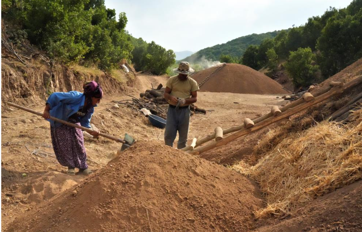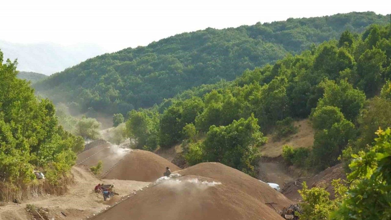 Orman İşletme Müdürlüğü tarafından belirlenen alanlarda günün ilk ışıklarıyla işe koyulan aileler, gün boyunca ateş karşısında is ve dumana aldırmadan kestikleri meşe odunlarını yakarak mangal kömürüne çeviriyor.