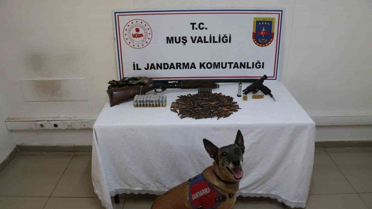 Muş İl Jandarma Komutanlığı ekipleri tarafından yürütülen istihbari çalışmalar sonucunda, merkezde ikamet eden S.A. isimli şahsın evinin bahçesindeki tezek yığınının altına silah gömdüğü bilgisi alındı. Alınan arama kararının ardından şüphelinin evinde, eklentilerinde ve aracında Merkez İlçe Jandarma Komutanlığı, JÖH timleri ve köpek unsurlarının katılımıyla arama yapıldı. Yapılan aramalarda 1 adet ruhsatsız tabanca, 1 adet ruhsatsız av tüfeği, 310 adet 7.62x39 mm fişek, 42 adet 12 kalibre av fişeği ve 29 adet 9x19 mm fişek ele geçirildi.