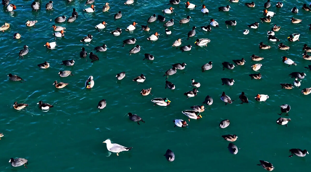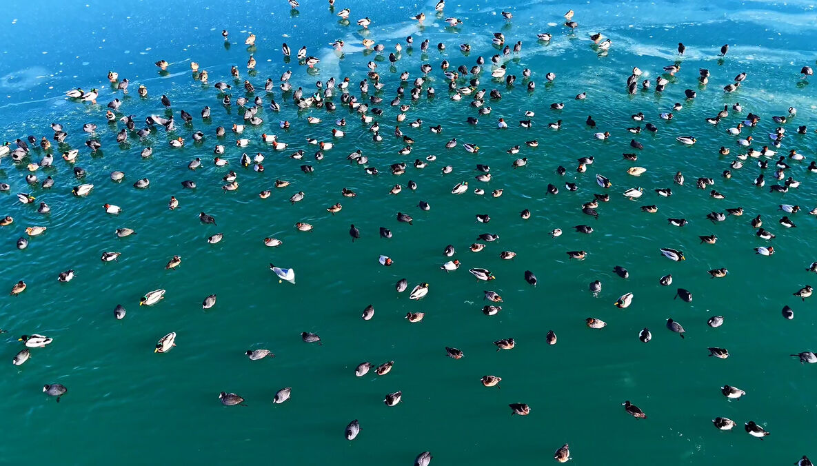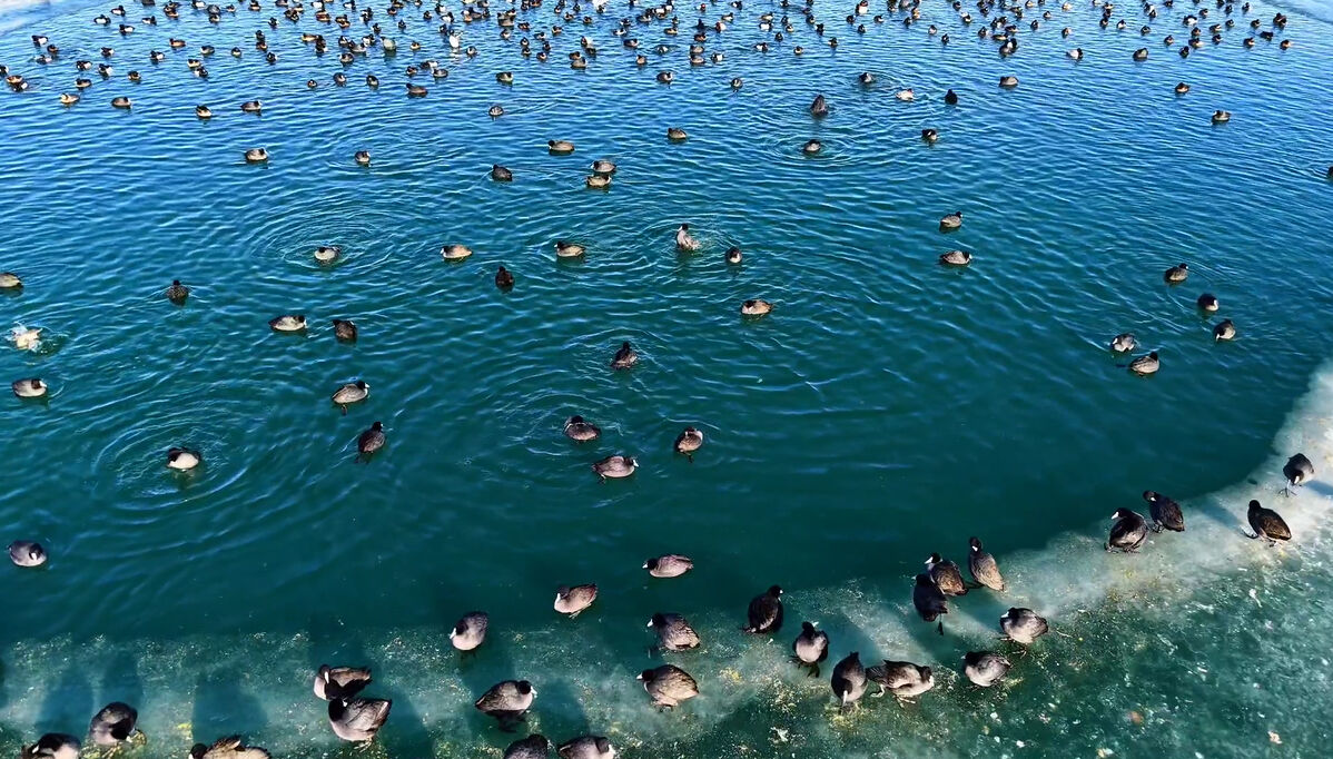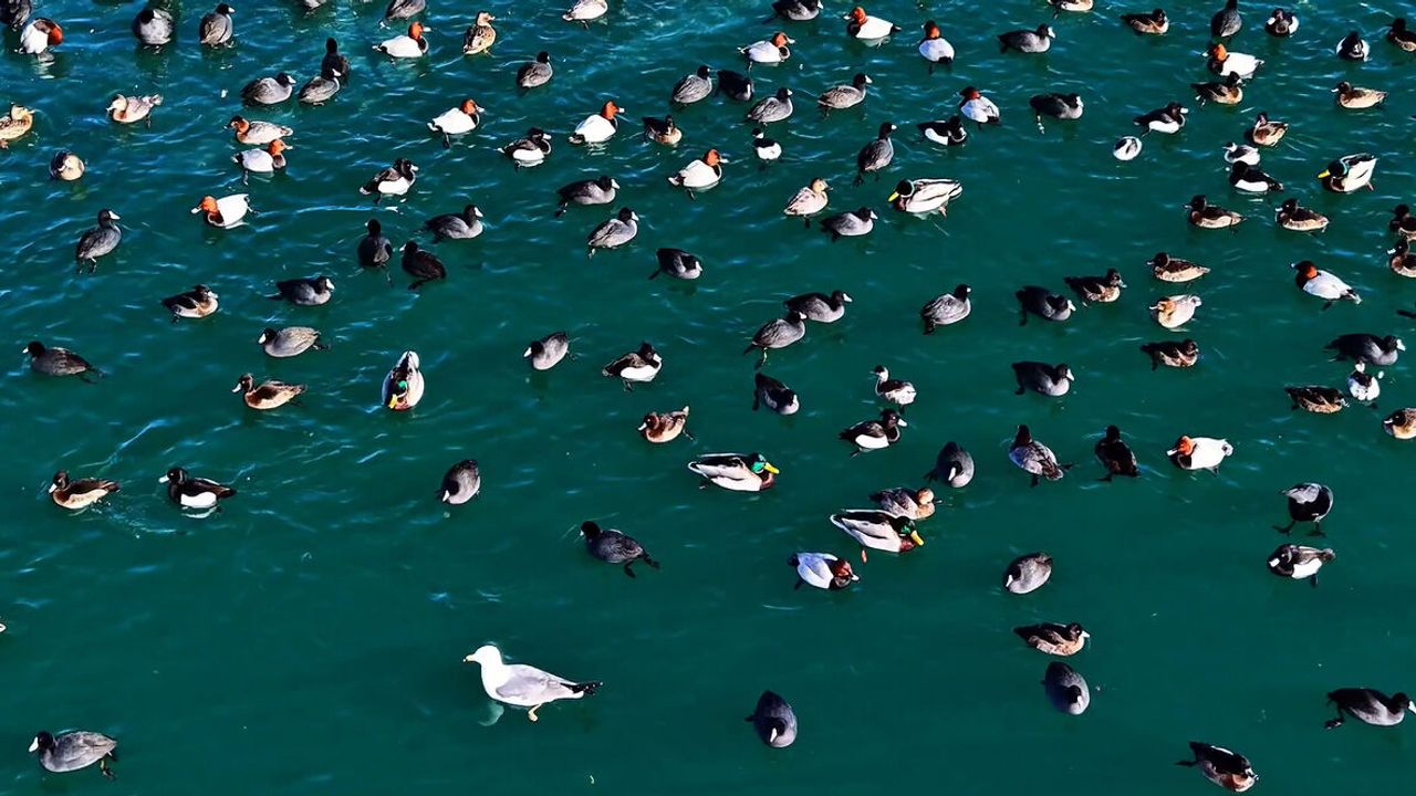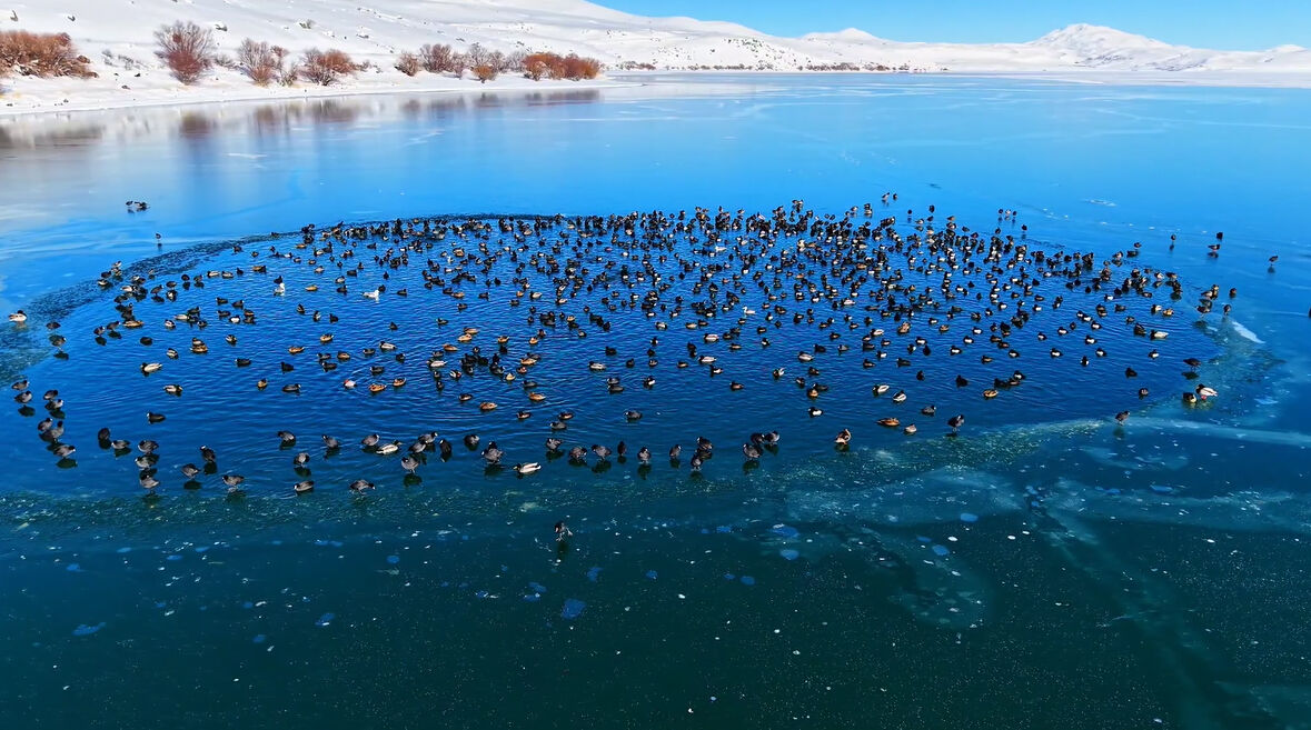 İçerik üreticisi Ercan Baş tarafından kaydedilen görüntülerde, buzların arasından oluşan su birikintilerinde bir araya gelen ördeklerin yüzmesi, kanat çırpması ve su üzerindeki zarif süzülüşleri dikkat çekti. Özellikle sürü halinde hareket eden kuşların göl yüzeyinde oluşturduğu ahenkli görüntüler izleyenleri hayran bıraktı.