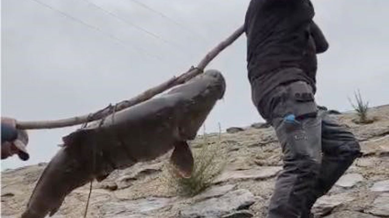 Elazığ'da amatör balıkçılar, Murat Nehri'nde at-çek yöntemiyle 60 kiloluk dev bir turna balığı yakaladı. Yakaladığı dev turnayı kıyıya çıkaran balıkçılar, 60 kiloluk dev turna balığını taşıyamayınca çam sırığına bağladıktan sonra omuzlarda taşıdılar. 2 balıkçı yakalanan dev turna balığını taşımak için zorlanırken, o anlar cep telefonu ile kayıt edildi.