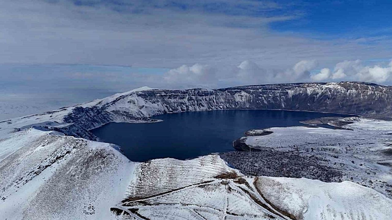 Bitlis'in Ahlat, Güroymak ve Tatvan ilçe sınırları içinde bulunan Nemrut Dağı'nda yer alan krater gölü, karla kaplanan dağ manzarasıyla etkileyici bir görüntü sunuyor.