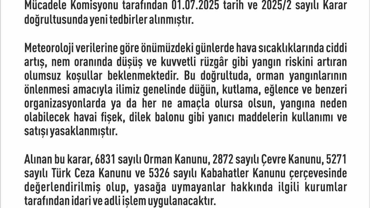Açıklamanın devamında, "Alınan bu karar, 6831 sayılı Orman Kanunu, 2872 sayılı Çevre Kanunu, 5271 sayılı Türk Ceza Kanunu ve 5326 sayılı Kabahatler Kanunu çerçevesinde değerlendirilmiş olup, yasağa uymayanlar hakkında ilgili kurumlar tarafından idari ve adli işlem uygulanacaktır. Vatandaşlarımızdan, orman varlıklarımızı korumak ve olası yangınların önüne geçmek adına alınan bu kararlara hassasiyetle uymaları beklenmektedir" ifadelerine yer verildi.
