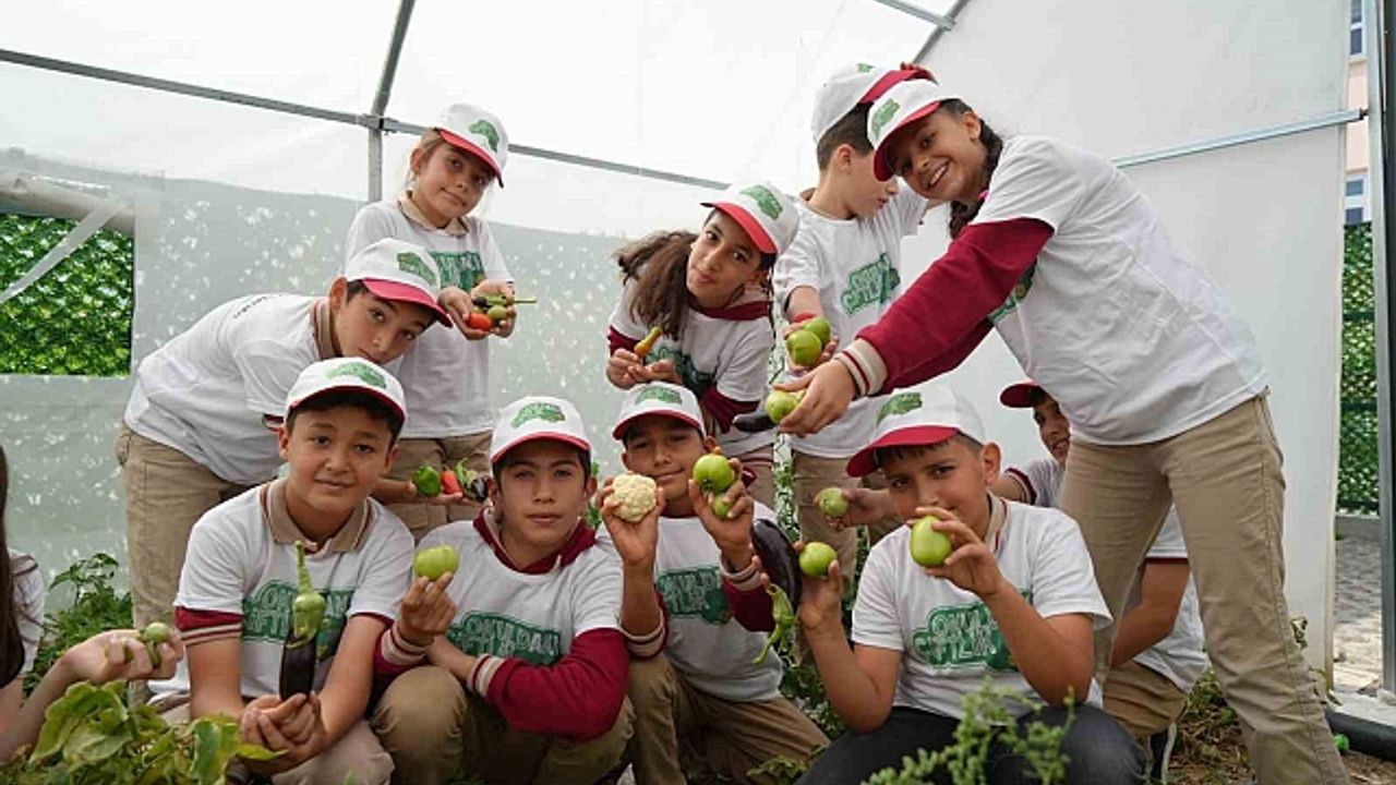 Domates, biber, patlıcan, karnabahar gibi mevsimlik sebze yetiştiren ortaokullu öğrenciler hem çiftçilik mesleğinin inceliklerini öğreniyor hem de sebzeleri dalından koparıp yemenin zevkini yaşıyorlar.