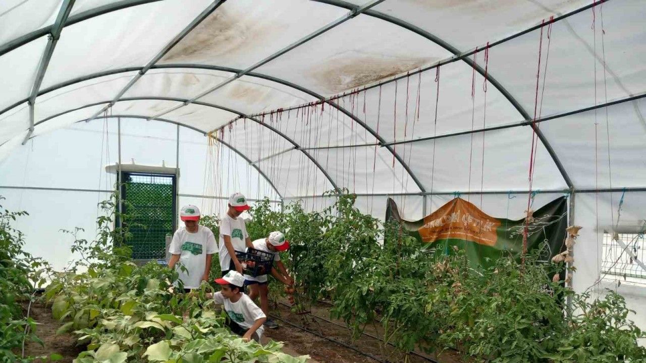Domates, biber, patlıcan, karnabahar gibi mevsimlik sebze yetiştiren ortaokullu öğrenciler hem çiftçilik mesleğinin inceliklerini öğreniyor hem de sebzeleri dalından koparıp yemenin zevkini yaşıyorlar.