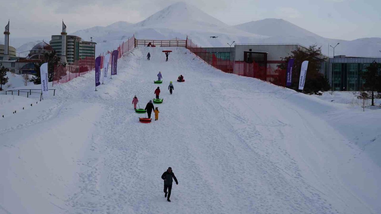 Dünyanın ve Türkiye'nin en önemli kayak pistlerini bünyesinde bulunduran Palandöken Kayak Merkezi yoğun ilgi devam ederken, Atatürk Üniversitesi yönetimi kampüs içinde de kayak ve kızak keyfi yaşamak isteyen öğrenciler için bir pist yaptı.