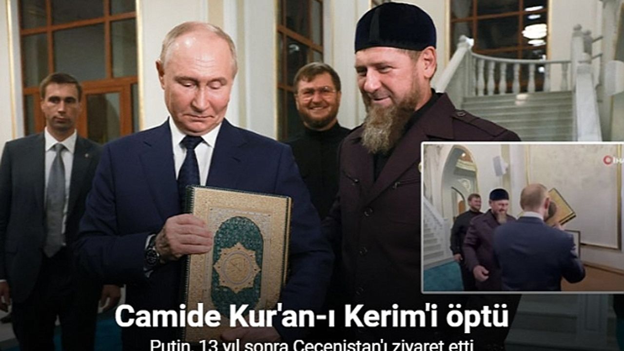 Rusya Devlet Başkanı Vladimir Putin'in 2011 yılından bu yana ilk kez Rusya'ya bağlı Çeçenistan Cumhuriyeti'ne gerçekleştirdiği sürpriz ziyaret gündemdeki yerini koruyor. Putin'in Çeçenistan lideri Ramazan Kadirov ve Çeçenistan Müftüsü Salah Mezhiev ile birlikte başkent Grozni'de yeni yapılan Hazreti İsa Cami'ni gezdi. Putin'in camiye hediye ettiği altın kaplamalı ve değerli taşlarla süslenmiş Kur'an-ı Kerim'i eline alarak öptüğü anlar dikkat çekti. Putin'in daha sonra Kuran-Kerim'i eline alarak Kadirov ve Müftü Mezhiev ile birlikte fotoğraf çektirdiği görüldü. Putin'in Kur'an-ı Kerim'e saygı gösterdiği anlar sosyal medyada kısa sürede gündem oldu.