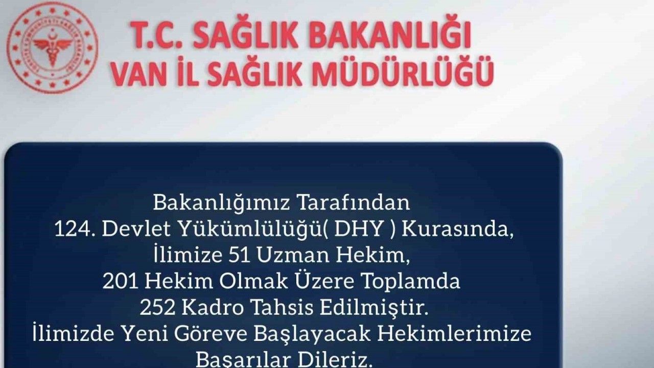 Sağlık Bakanlığı tarafından gerçekleştirilen 124. Devlet Hizmet Yükümlülüğü (DHY) Kurası kapsamında Van’a 51 uzman hekim ve 201 hekim olmak üzere toplamda 252 yeni doktor ataması yapıldı.