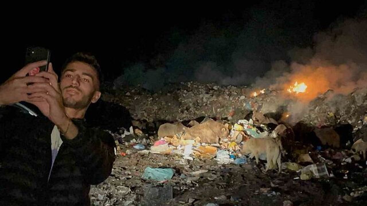 Sarıkamış'ta kış uykusu öncesi yiyecek bulmak için ilçe çöplüğüne inen bozayılarla özçekim (selfie) yapmaya çalışan genç, tehlikelere meydan okudu.