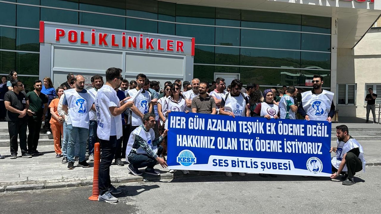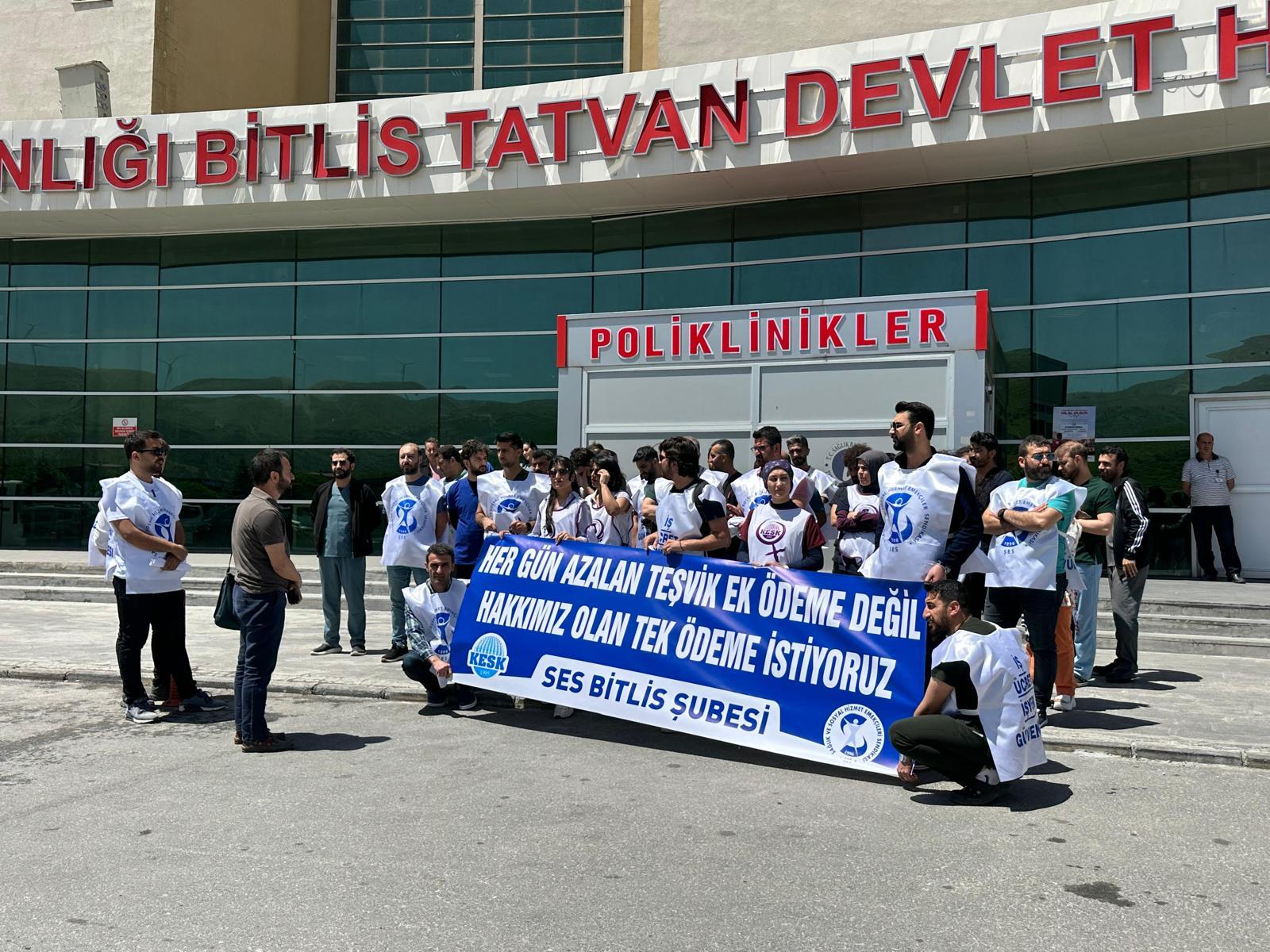 Yapılan basın açıklamasında, günden güne artan enflasyon karşısında ezilen sağlık emekçilerinin mağduriyet yaşadığı ifade edildi. Yapılan açıklamada şöyle denildi; “6 Ağustos 2024 tarihinde yürürlüğe giren Sağlık Bakanlığı Ek Ödeme Yönetmeliği, sağlık emekçilerinin yıllardır süren gelir güvencesi sorununu daha da derinleştirmiştir. Yönetmelikle birlikte teşvik ödemeleri; belirsiz, keyfi ve şeffaflıktan uzak bir şekilde dağıtılmaya başlanmış, sağlık çalışanlarının maaşları adeta piyango sistemine dönüştürülmüştür. Bu durum sadece gelir kaybına değil, aynı zamanda çalışma huzurunun ve motivasyonun ciddi biçimde bozulmasına da neden olmuştur. Ek ödeme sisteminde yapılan bu değişiklikler, emekçilerin zaten kırılgan olan ekonomik koşullarını daha da ağırlaştırmıştır. Giderek artan enflasyon karşısında maaşlarımız, her ay erimekte; yapılan zamlar, daha elimize geçmeden anlamını yitirmektedir. TÜİK verilerine göre resmi enflasyon yüzde 70'lere dayanmışken, bizlerin aldığı maaş artışları bu oranların çok altında kalmaktadır. Gerçek enflasyon ise mutfaktaki yangında, pazardaki fiyatlarda, kira bedellerinde kendini göstermektedir. Kısacası, maaşlarımız enflasyon karşısında savunmasız bırakılmıştır. Sağlık emekçileri için belirlenen ücretler, artık yoksulluk sınırının dahi altındadır. Türkiye'de dört kişilik bir ailenin yoksulluk sınırı 80 bin TL'ye yaklaşmışken, sağlık çalışanları bu rakamların çok gerisinde, insanca yaşam koşullarından uzak bir hayata mahkûm edilmektedir. Gecesi gündüzüne karışan nöbetlerin, pandemi döneminde alkışlanan fedakârlıkların karşılığı bu olmamalıdır. Bizler adil, sürdürülebilir ve yoksulluk sınırının üzerinde bir temel ücret istiyoruz. Geleceğimizi güvence altına alacak kalıcı bir gelir düzeni talep ediyoruz.”