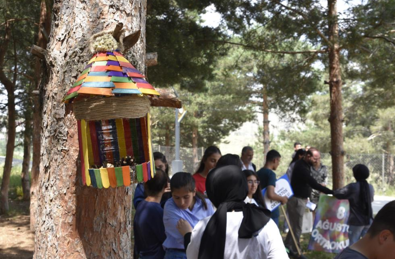 Yaklaşık bir hafta içinde yaptıkları 20 kadar renkli ve sevimli yuvalar, Bitlis Mevlana Millet Bahçesi’ndeki ağaçlara asıldı. Din Kültürü ve Ahlak Bilgisi dersinde gördükleri konudan etkilenen öğrenciler Cumhurbaşkanı Recep Tayyip Erdoğan’ın eşi Emnie Erdoğan’ın himayelerinde yürütülen ’Sıfır Atık Projesi’ne atıf yaparak topladıkları atık malzemelerden kuş yuvaları yaptı. Yuvaları okullarında yapıp, boyayan öğrenciler Bitlis-Mevlana Millet Bahçesindeki ağaçlara astı. Bitlis Belediye Başkanı Nesrullah Tanğlay’ın da katıldığı etkinlikte öğrenciler tarafından yapılan yaklaşık 30 kuş yuvası park içerisindeki ağaçlara asıldı. Öğrencilerle tek tek sohbet eden Bitlis Belediye Başkanı Nesrullah Tanğlay, "8 Ağustos Ortaokulu öğrencileri Emine Erdoğan hanımefendinin himayelerinde yürüyen ‘Sıfır Atık’ projesi kapsamında çok güzel bir proje yapmışlar. Geri dönüşüm malzemelerinden bizim millet bahçemize kuş yuvaları yapmışlar. Birbirinden kıymetli ve birbirinden güzel kuş yuvaları yapmışlar. Bu konuda hem gençlerimize teşekkür ediyoruz, hem de bu desteği öğrencilere veren öğretmenlerimize teşekkür ediyorum. İnşallah bunun devamını da getireceğiz. ‘Sıfır Atık’ projesine destek veren tüm biz de aynı desteği vereceğiz."