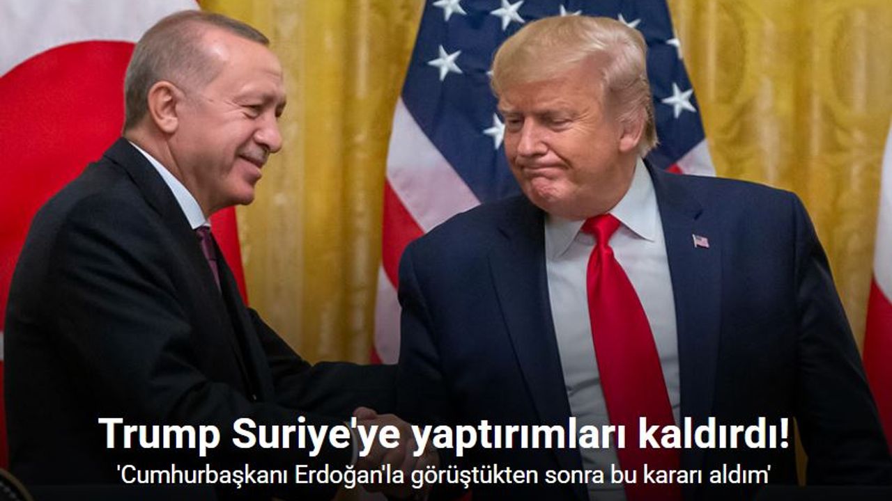 ABD Başkanı Donald Trump, Suriye’ye yönelik tüm yaptırımları kaldıracaklarını açıklayarak, söz konusu kararı Cumhurbaşkanı Recep Tayyip Erdoğan ve Suudi Arabistan Veliaht Prens Muhammed bin Selman’la aldığını ifade etti.