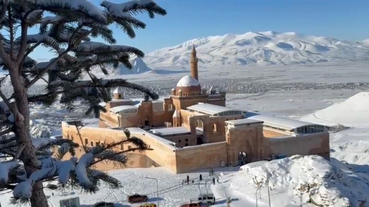 Tarihi dokusu ve görkemli yapısıyla dört mevsim ayrı bir güzelliğe sahip olan İshak Paşa Sarayı, kışın sunduğu görsel şölenle Ağrı'nın kültürel ve turistik değerlerini bir kez daha ön plana çıkarıyor. Karla kaplı dağlar ve sisle bütünleşen saray silueti, ziyaretçilere unutulmaz anlar yaşatıyor.