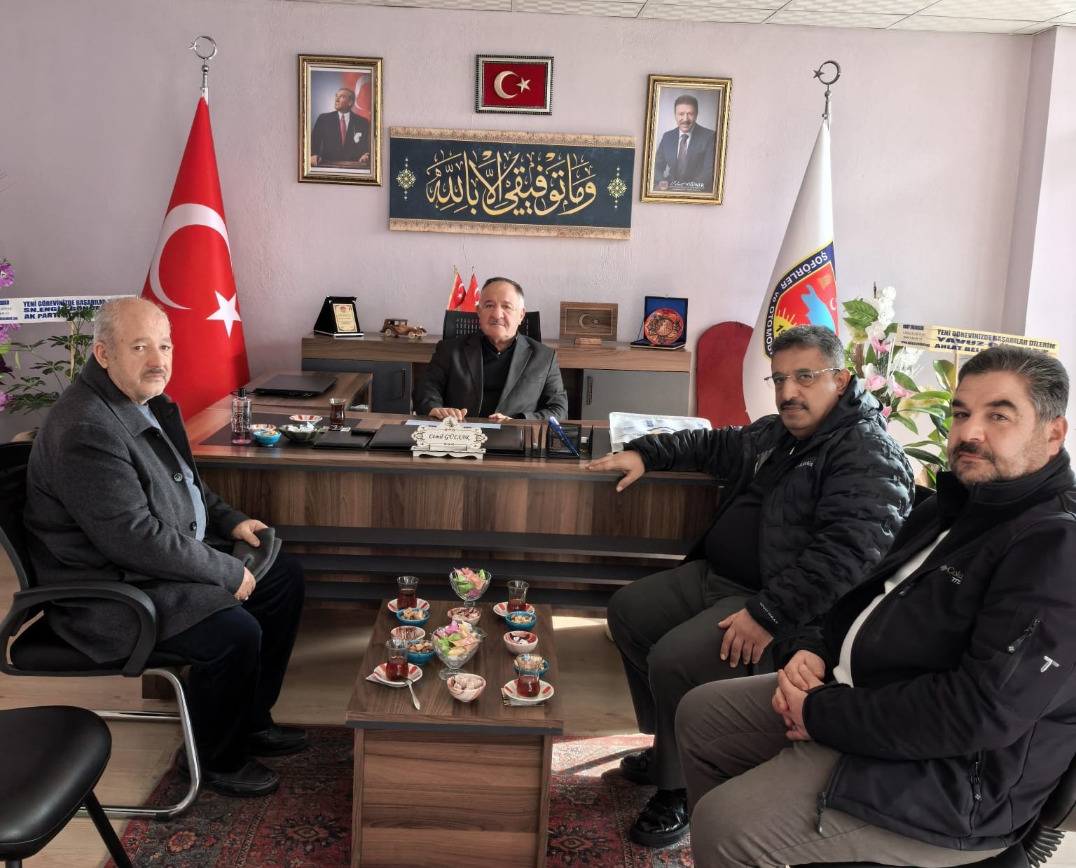 TATSO Başkanı Bilal Adabağ ile Başkan Yardımcısı Yılmaz Lebit, gerçekleştirilen genel kurulların ardından yeniden başkanlığa seçilen Ahlat Esnaf ve Sanatkârlar Odası Başkanı Mesut Şeker ile Ahlat Şoförler ve Otomobilciler Esnaf Odası Başkanı Cemil Gülsar’a hayırlı olsun ziyaretinde bulundu.