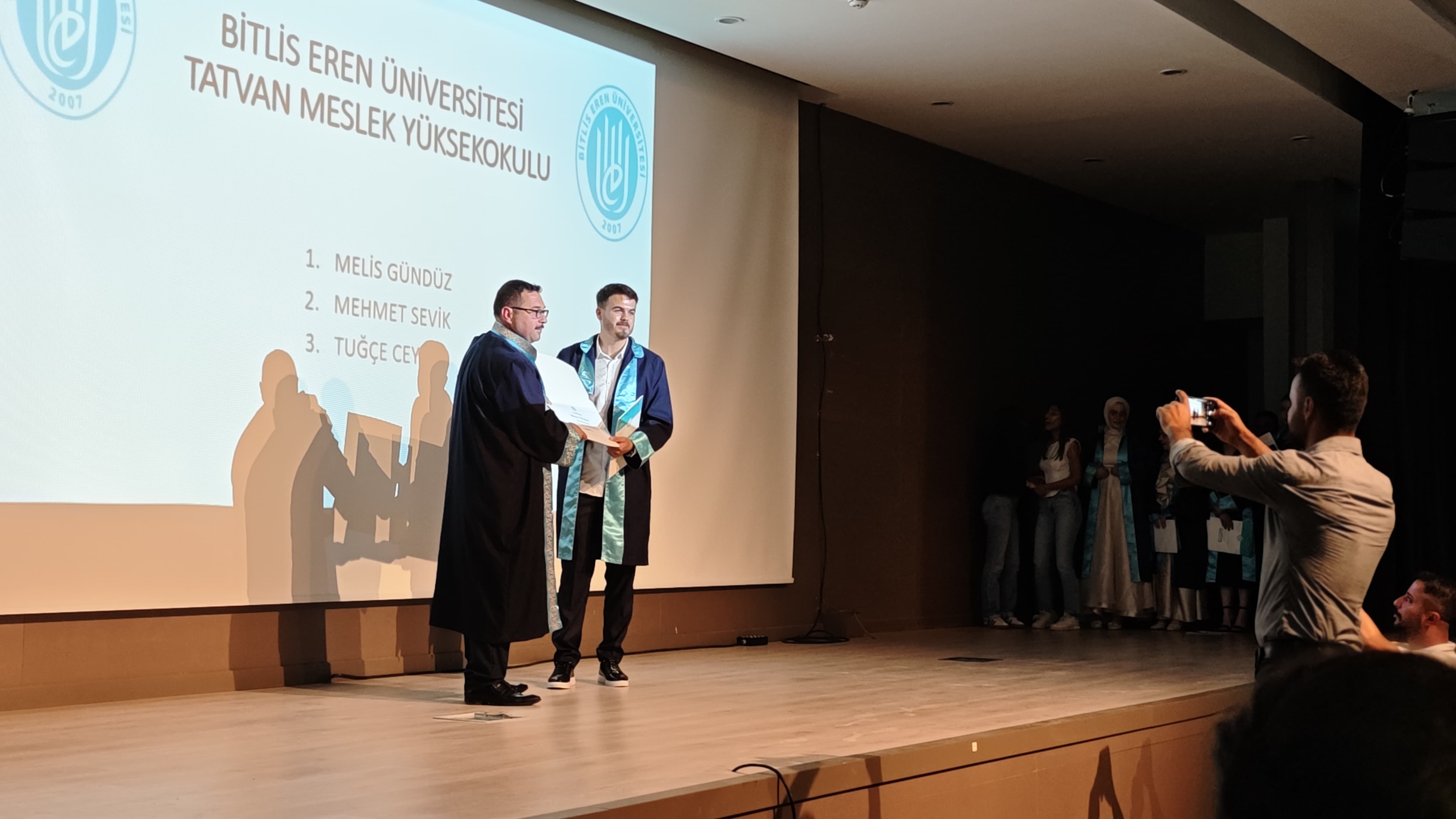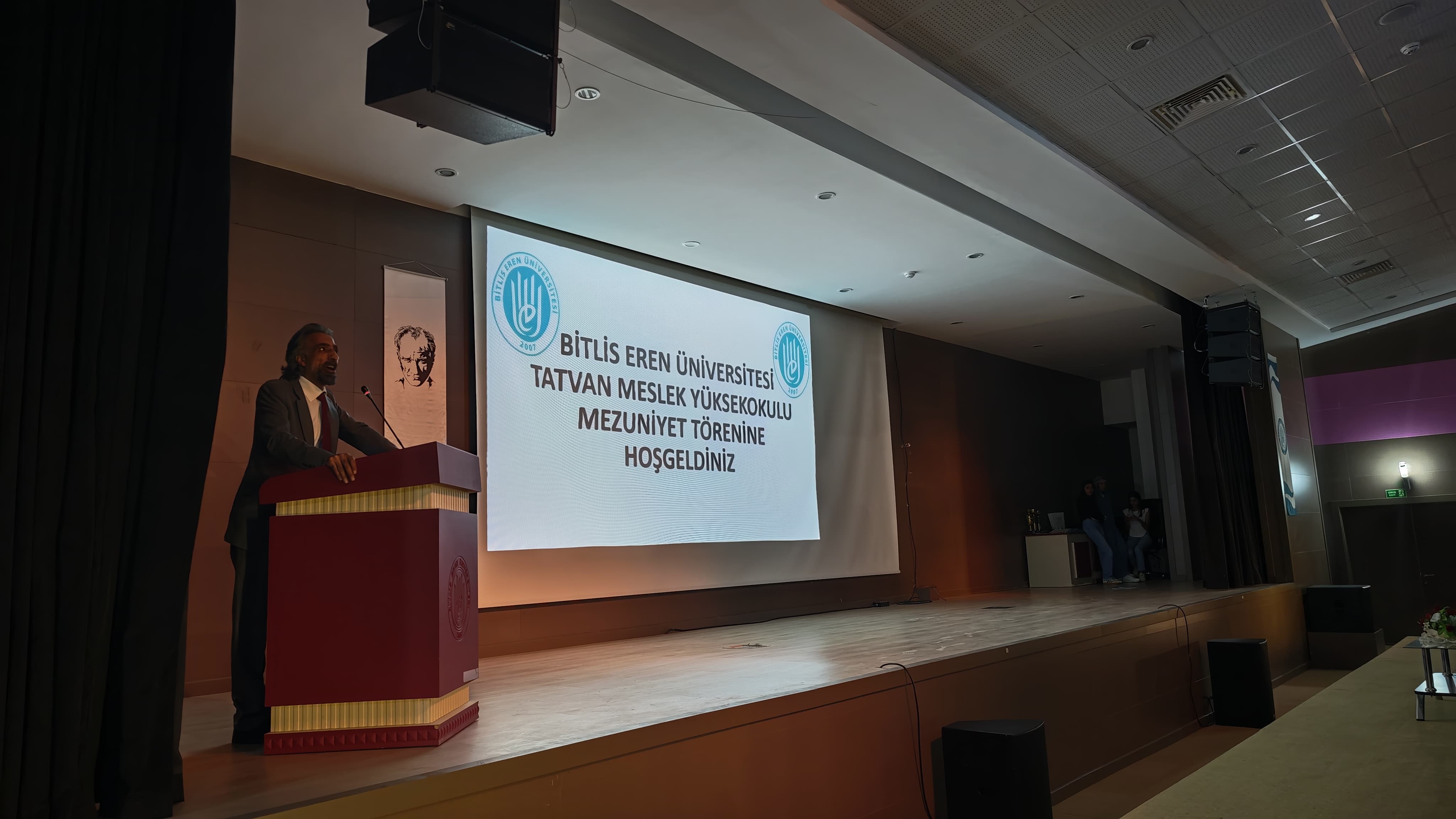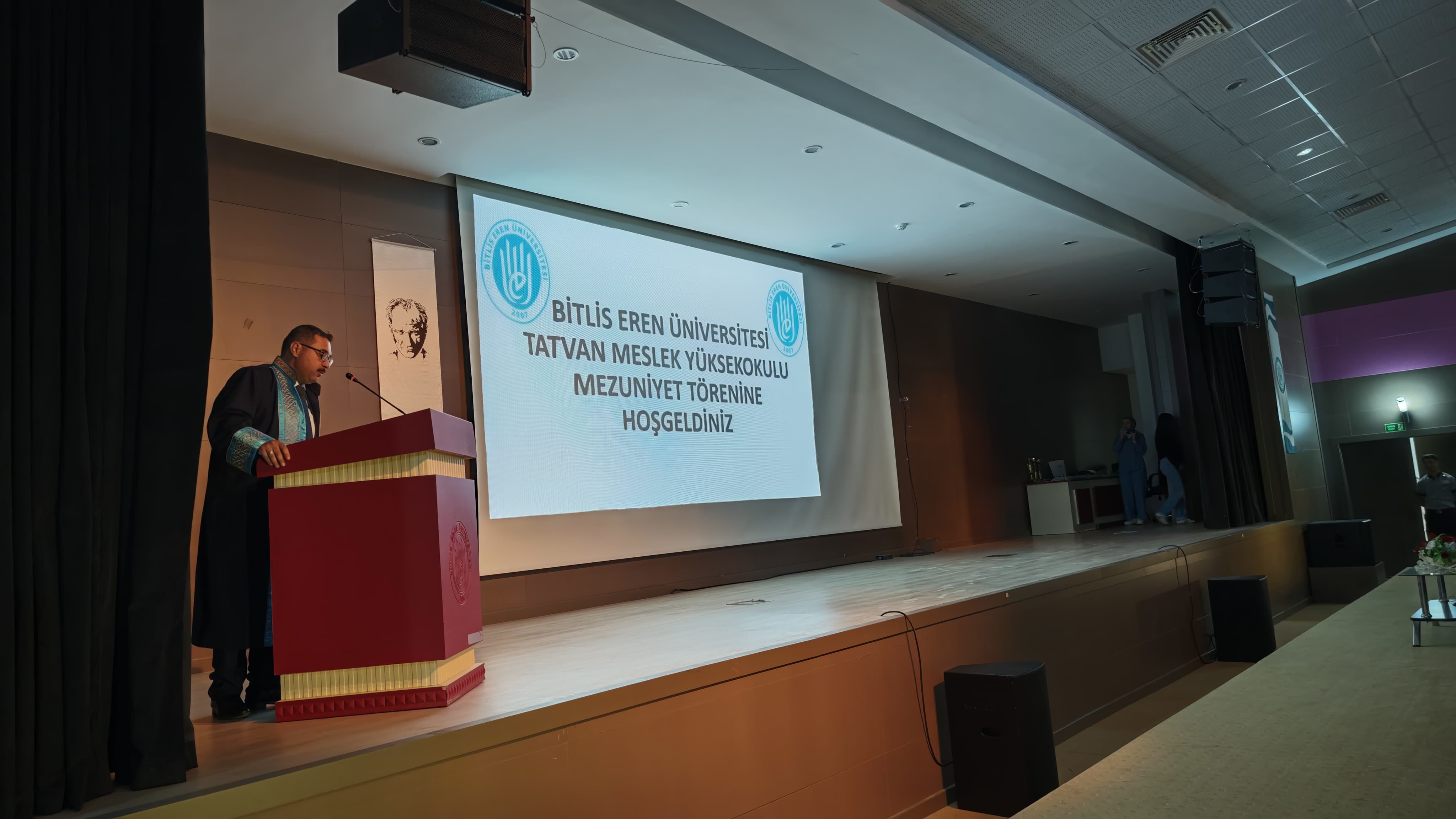 Tatvan MYO konferans salonunda düzenlenen mezuniyet törenine akademisyenler, öğrenciler ve aileleri katıldı. Programda ilk olarak Bitlis Eren Üniversitesi rektör Yardımcısı Prof Dr. Ayhan Yılmaz ve Tatvan Meslek Yüksekokulu Müdürü Doç. Dr. Yusuf Alan birer konuşma yaptılar. Daha sonra okulun bölüm birincilerine mezuniyet belgeleri takdim edildi. Mezuniyet töreni, kep atma seremonisi ve toplu hatıra fotoğraf çekimiyle sona erdi.