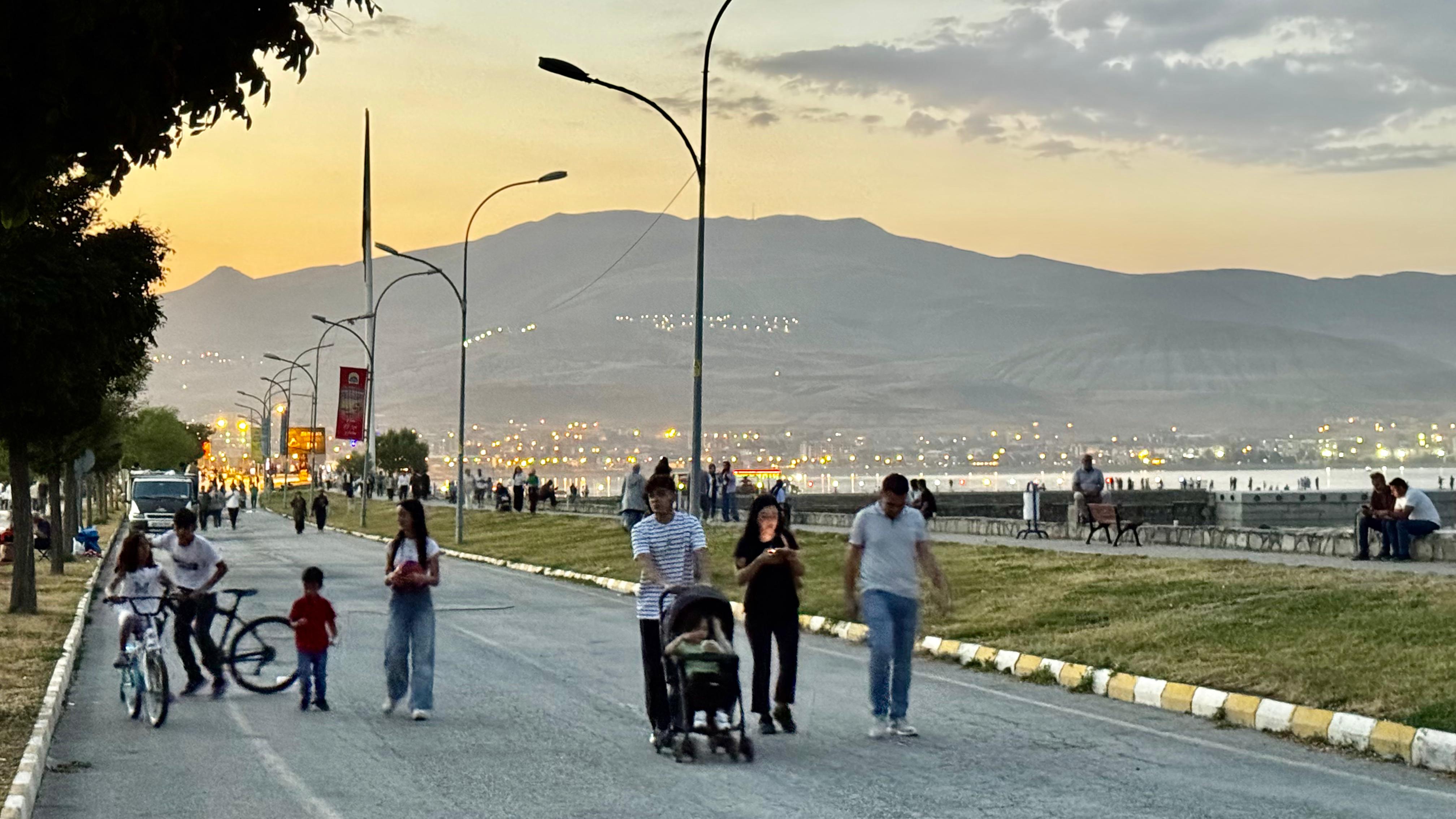 Tatvan Belediyesi tarafından düzenlenen sahil bandı boyunca yürüyüş yapan vatandaşlar, Van Gölü’nün eşsiz manzarası eşliğinde keyifli anlar yaşıyor. Kimi aileler sahil kenarında oturarak gün batımını izlerken, kimileri ise yürüyüş yaparak temiz havanın tadını çıkarıyor.