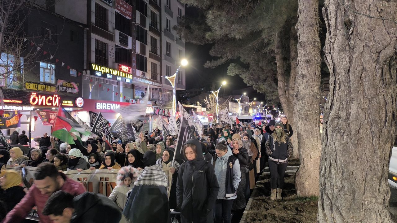 Tatvan İbadullah Camii’nde kılınan Yatsı Namazı ve yapılan duaların ardından cami önünde toplanan vatandaşlar, Bitlis Filistin Dayanışma Platformu’nun öncülüğünde Filistin Parkı’na doğru yürüyüşe geçti.
