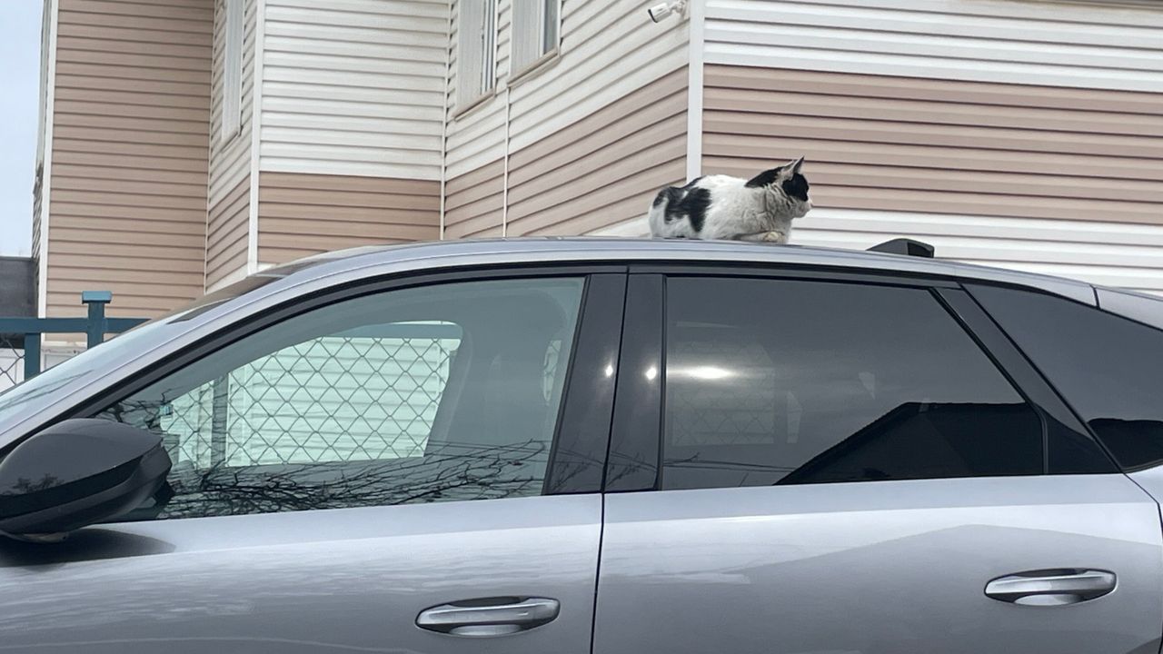 Bitlis’in Tatvan ilçesine bağlı Hidayet Mahallesi’nde bir aracın üzerine çıkan kedi, görenleri şaşırttı.