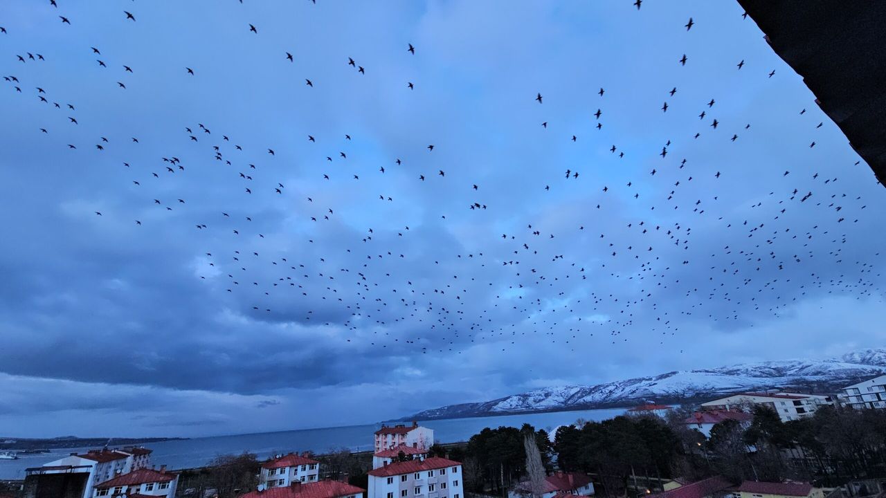 Van Gölü kıyısında beliren kuş sürüleri, birlikte hareket ederek gökyüzünde farklı şekiller oluşturdu. İlçe merkezinden de gözlemlenen doğa olayında, sığırcıkların uyumlu uçuşları gökyüzünü adeta kapladı.