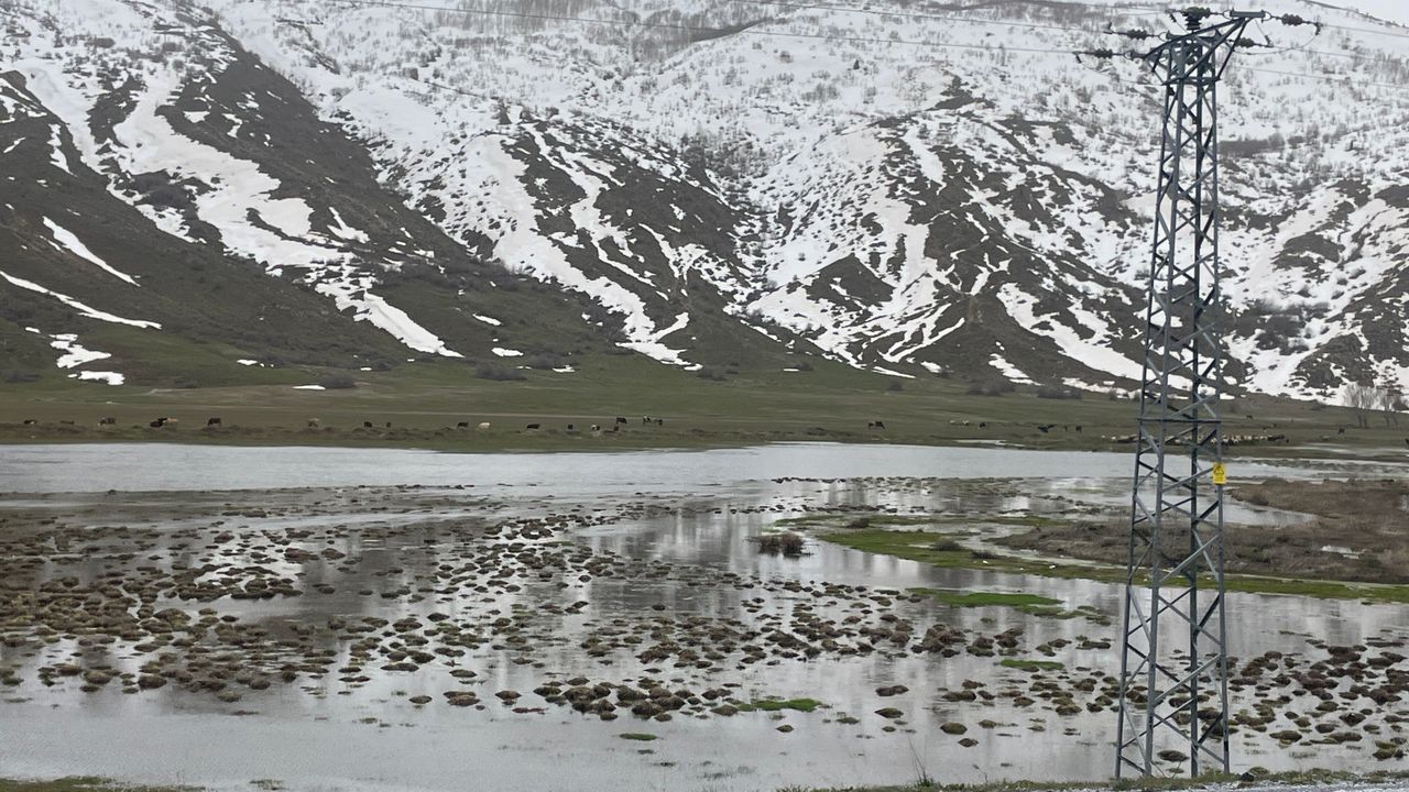 Bitlis’in Tatvan ile Hizan ilçeleri arasında bulunan Güzeldere Vadisi’nde kar yağışının ardından eriyen kar suları tarlalarda göletler oluşturdu.