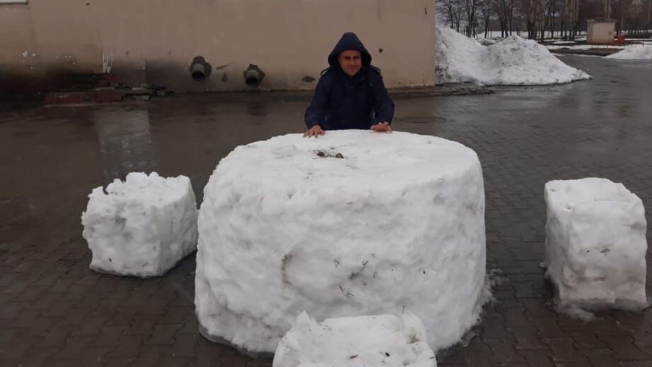 Bitlis’in Tatvan ilçesinde yaşayan Mehmet Okay, etkili olan kar yağışını fırsata çevirerek kardan masa ve sandalye yaptı.