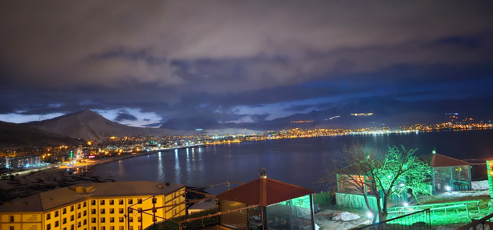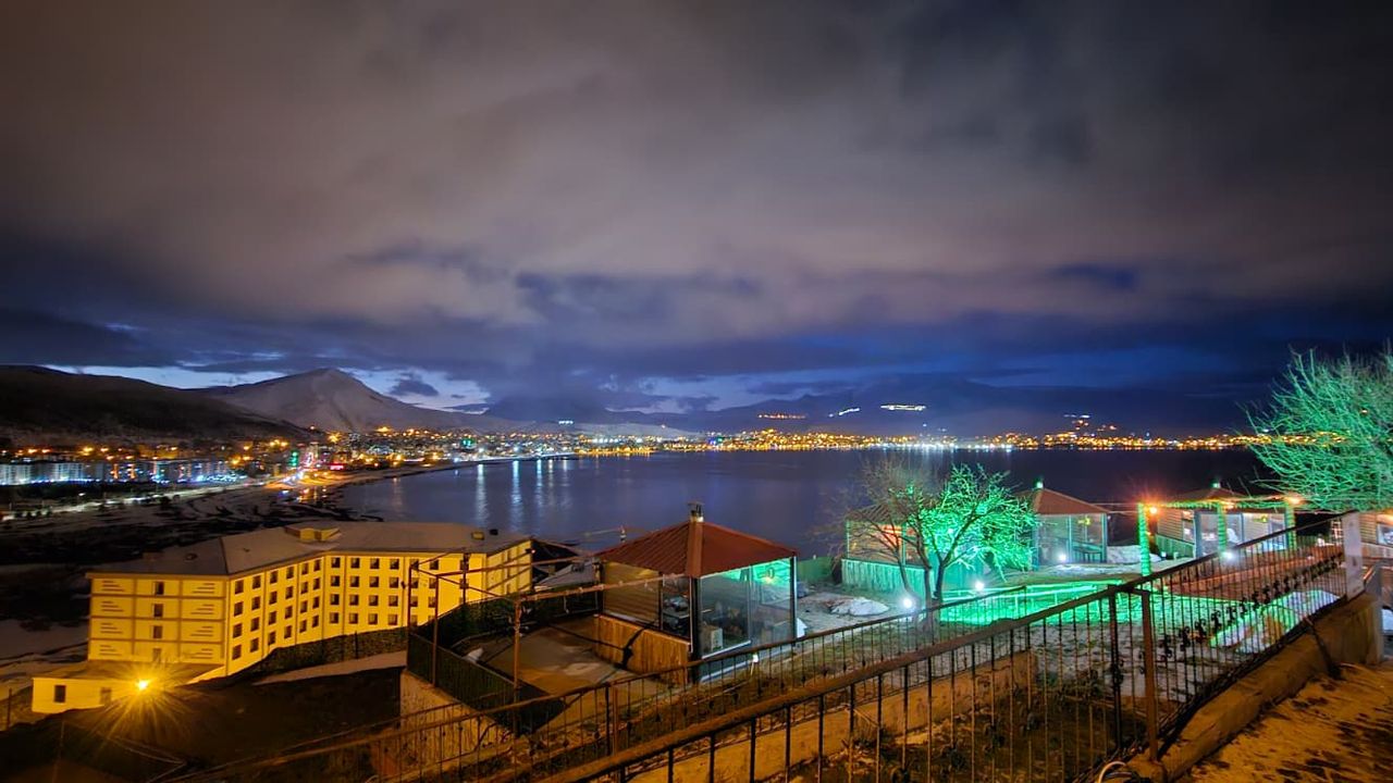 Gazeteci Hakan Okay’ın objektifine yansıyan karelerde, şehir ışıkları ile Van Gölü’nün karanlık silueti uyum içinde yer aldı.