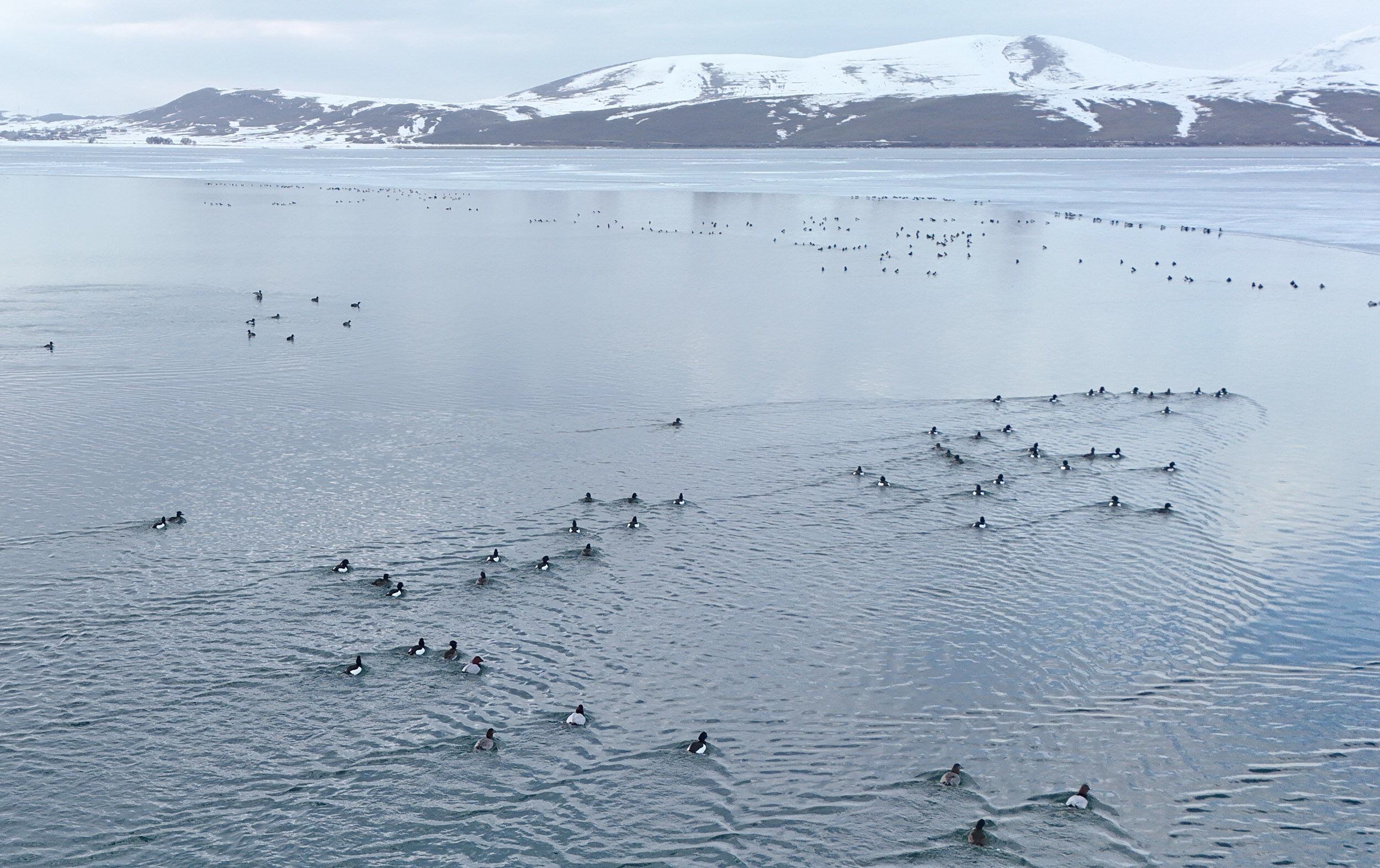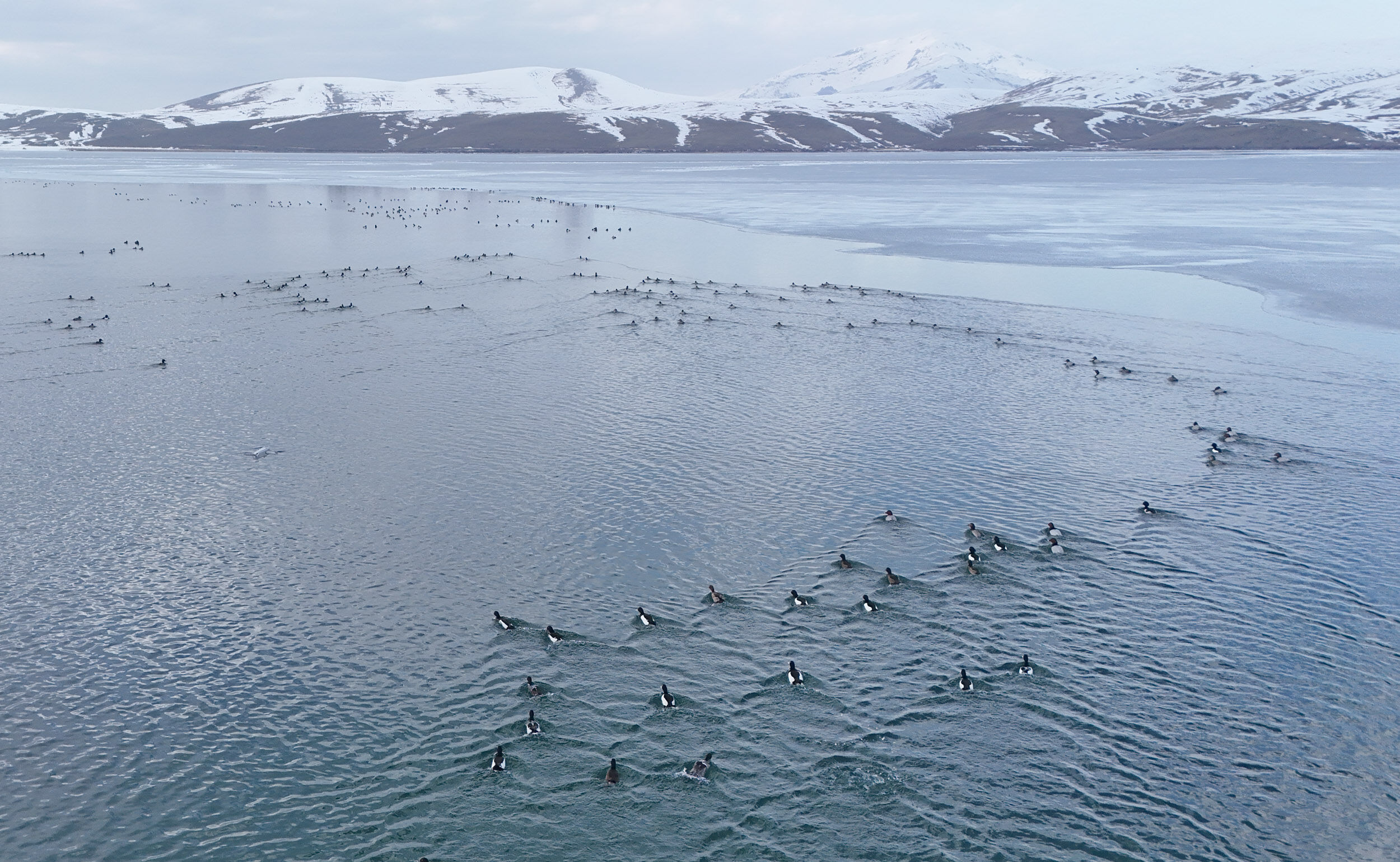 Ördeklerin kanat çırpışları ve su üzerindeki zarif süzülüşleri kartpostallık görüntüler oluştururken, ortaya çıkan manzara, doğaseverlerin ilgisini çekti. Bölge sakinleri, bu yıl kışın sert geçtiğini ancak havaların erken ısınmasıyla birlikte göldeki buz tabakasının hızla çözüldüğünü belirtti.