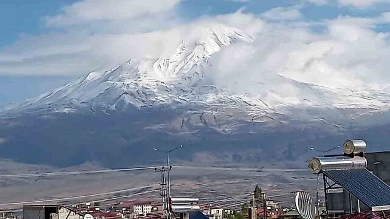 Ağrı'da hava sıcaklarının aniden düşmesiyle beraber kentin yüksek kesimlerindeki bazı bölgelerde kar yağışı etkili olurken, Türkiye'nin en yüksek noktasında bulunan 5 bin 137 metre yüksekliğe sahip Ağrı Dağı da beyaza büründü. Bulutların arasından ihtişamıyla yükselen Ağrı Dağı, zirvesindeki karla göz kamaştırdı.