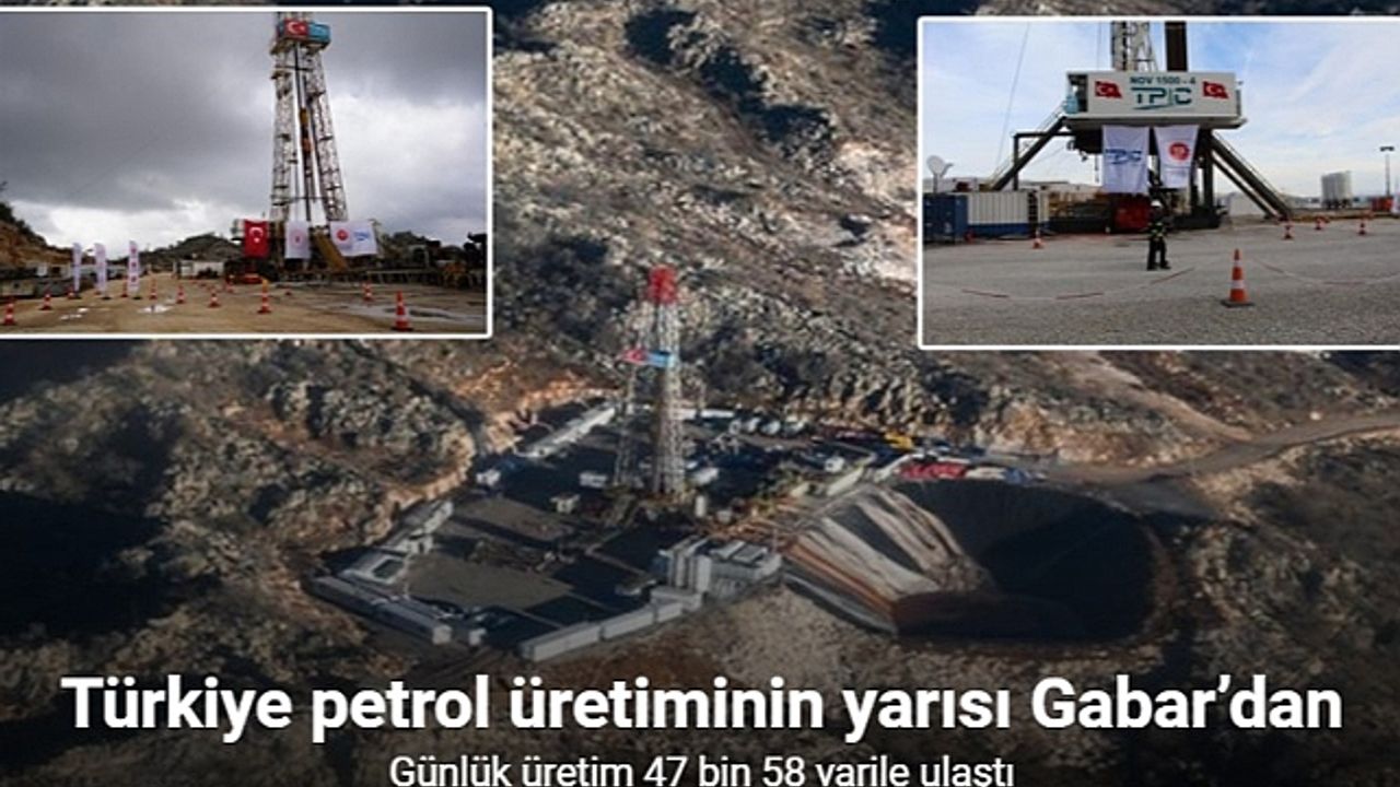 Enerji ve Tabii Kaynaklar Bakanlığı sosyal medya hesabından yaptığı paylaşım ile Türkiye'de günlük petrol üretiminde yeni rekora ulaşıldığını belirtti. Türkiye genelinde günlük ham petrol üretiminin 107 bin 621 varile ulaşıldığını Şırnak Gabar'da ise günlük üretimin 47 bin 58 varile ulaşıldığı belirtildi.