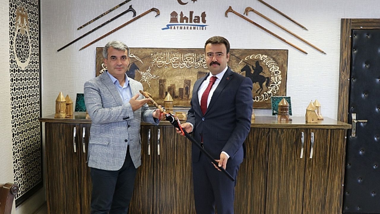 Türkiye Şeker Fabrikaları Genel Müdürü ve Yönetim Kurulu Başkanı Dr. Muhiddin Şahin, Ahlat Kaymakamı Batuhan Bingöl’ü ziyaret etti. Genel Müdür Şahin, beraberindeki heyetle birlikte Kaymakam Bingöl’ü makamında ziyaret ederek bir süre sohbet etti. Ziyaret sırasında, Ahlat’ın tarım potansiyeli ile ilgili görüş alışverişinde bulunuldu. Ziyaretin sonunda Kaymakam Bingöl, Genel Müdür Şahin’e Ahlat’a özgü geleneksel bir baston hediye etti.