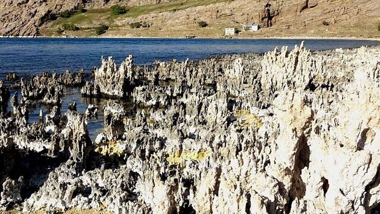 Türkiye'nin tek sodalı gölü olma özelliğini taşıyan Van Gölü'nde, son yıllarda sularının çekilmesiyle sahiller mikrobiyalit tarlasına döndü.