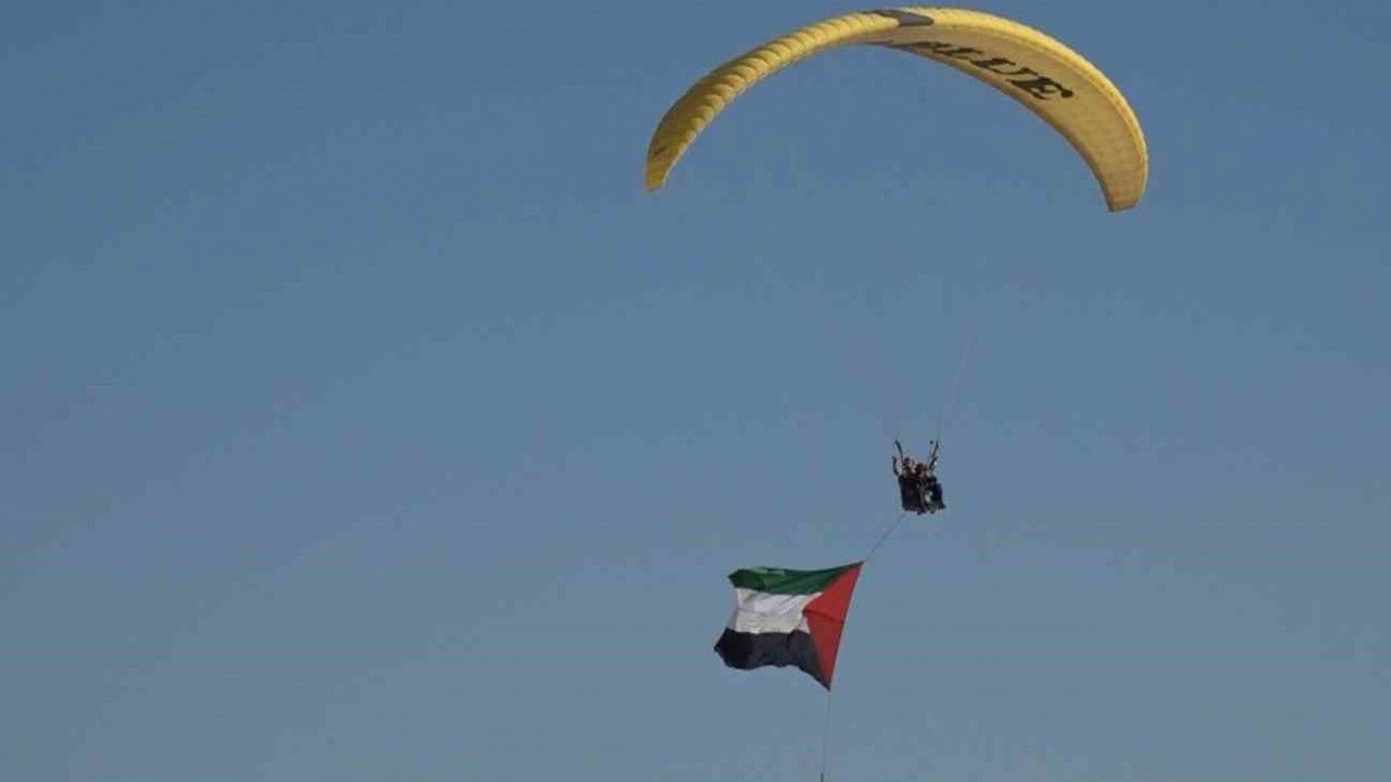 Antalyalı Yamaç Paraşütü Pilotu Mehmet Sadık Göller, takım arkadaşıyla birlikte Van Gölü semalarında Filistin bayrağı açtı.