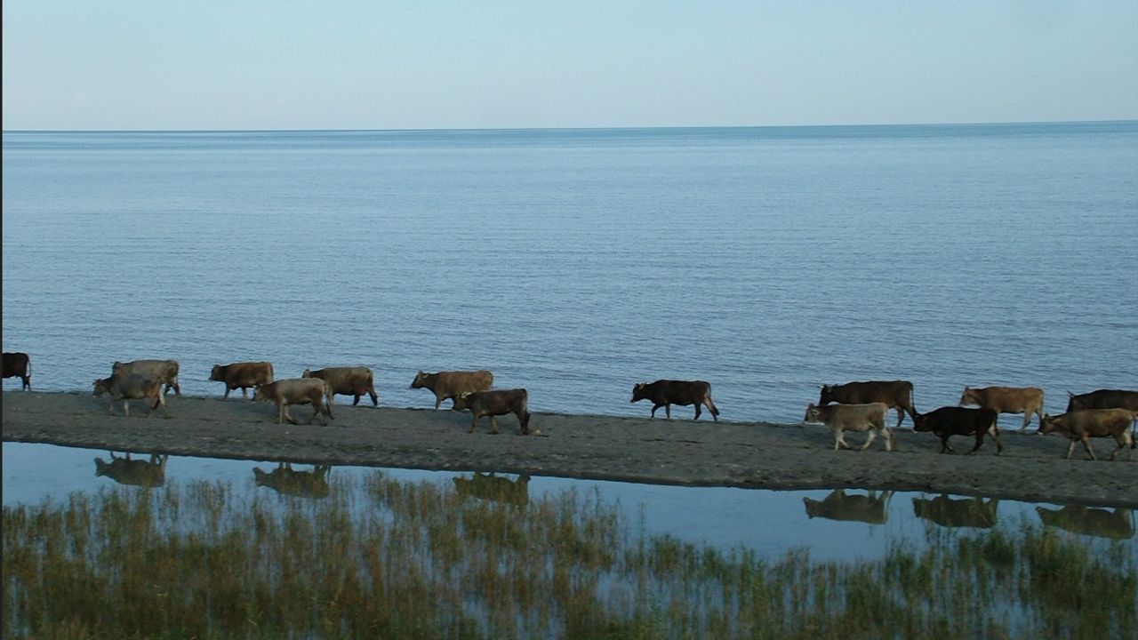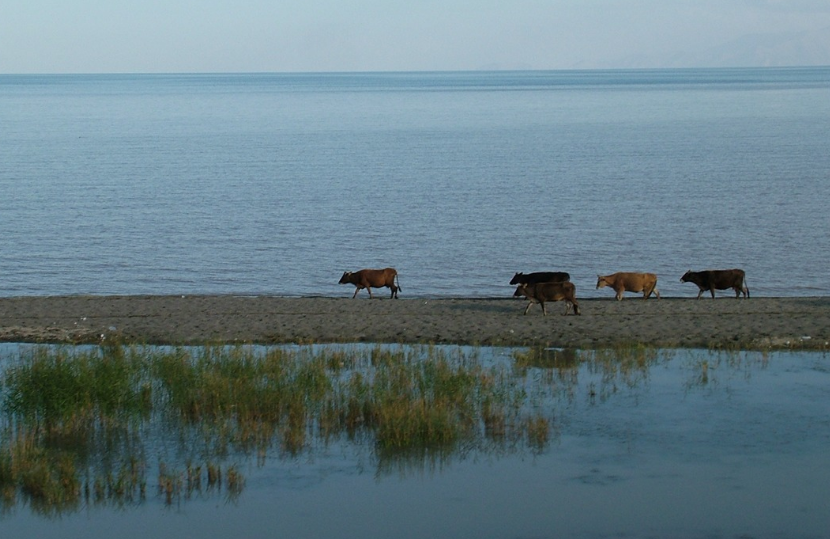 Bitlis’in Ahlat ilçesinde Van Gölü kıyısında bazı akşamlar dikkat çeken bir manzara yaşanıyor. Gün boyunca meralarda otlayan büyükbaş hayvanlar, akşam saatlerinde ahırlarına dönerken Van Gölü’nün kumsallarını kullanıyor.