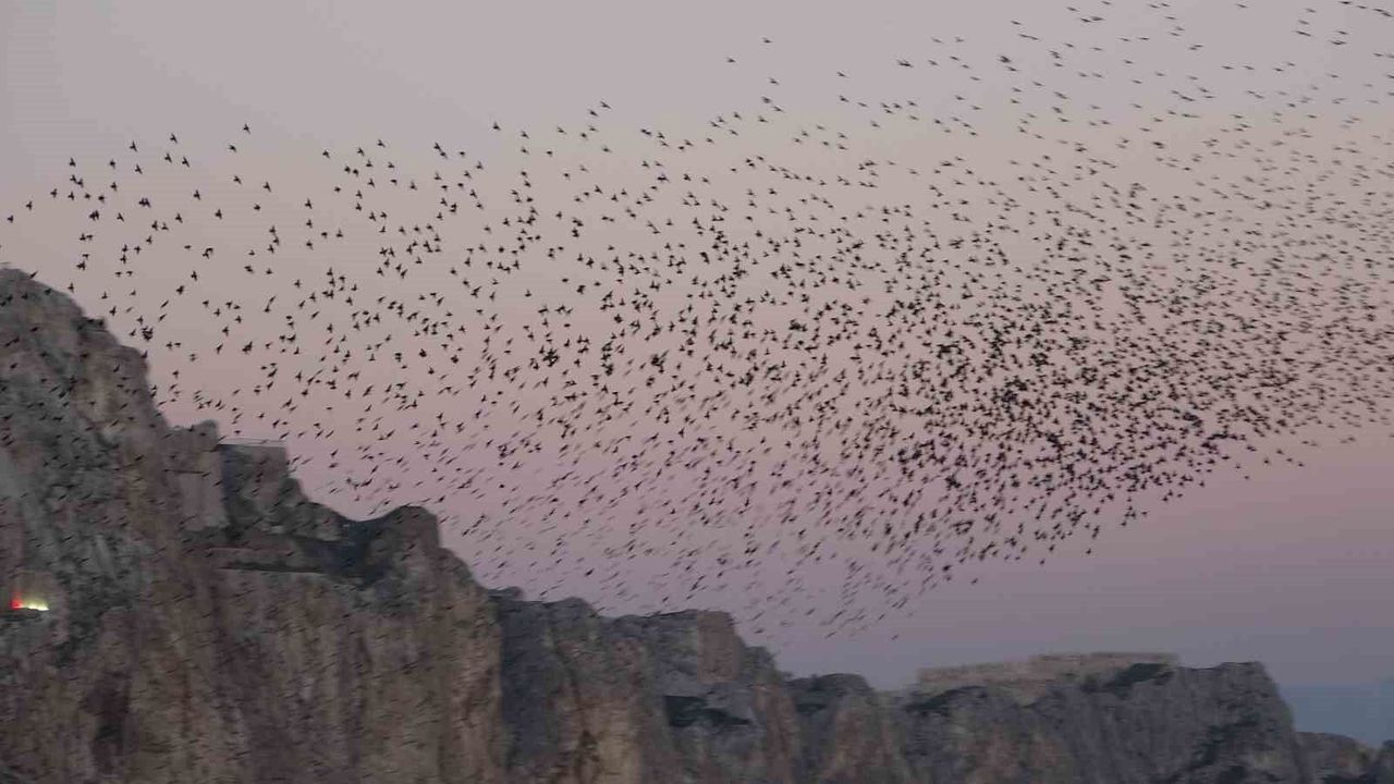 Van'da dün akşam yüzlerce sığırcık kuşu, tarihi Van Kalesi'nin güneyinde eşsiz bir gösteri sundu.